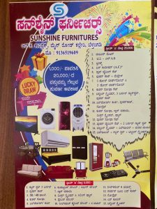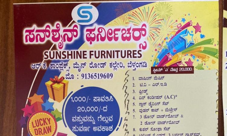 ಬೆಳ್ತಂಗಡಿ: ಕಲ್ಲೇರಿಯ ಆರ್.ಕೆ ಕಾಂಪ್ಲೆಕ್ಸ್ ನಲ್ಲಿ ಕಾರ್ಯ ನಿರ್ವಹಿಸುತ್ತಿರುವ ಸನ್ ಶೈನ್ ಫರ್ನೀಚರ್ಸ್ ಮಳಿಗೆಯಲ್ಲಿ ರೂ20,000, ಹಾಗೂ 6000ರೂಗಳ ಸ್ಕೀಮ್ ‘ಎ’ ಹಾಗೂ ‘ಬಿ’ ಆರಂಭವಾಗಿದೆ. 1000ರೂ ಪಾವತಿಸಿ 20,000ರೂಗಳ ವಸ್ತುಗಳನ್ನು ಗೆಲ್ಲುವ ಅವಕಾಶ ಗ್ರಾಹಕರಿಗಿದೆ.