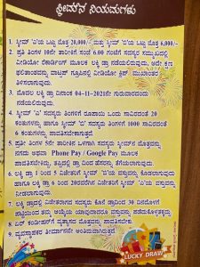 ಲಕ್ಕಿ ಡ್ರಾ 1ರಿಂದ 5ವಿಜೇತರಿಗೆ ಸ್ಕೀಮ್ ‘ಬಿ’ಯ ವಸ್ತಗಳನ್ನು ಕೊಡಲಾಗುವುದು ಹಾಗೂ ಲಕ್ಕಿ ಡ್ರಾ 6 ರಿಂದ 20ರವರೆಗಿನ ವಿಜೇತರಿಗೆ ಸ್ಕೀಮ್ ‘ಎ’ಯ ವಸ್ತಗಳನ್ನು ನೀಡಲಾಗುವುದು.