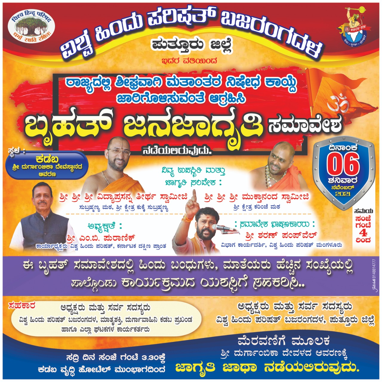 ವಿಶ್ವ ಹಿಂದೂ ಪರಿಷತ್ ಕರ್ನಾಟಕ ದಕ್ಷಿಣ ಪ್ರಾಂತ ಕಾರ್ಯಾಧ್ಯಕ್ಷರಾದ ಎಂ.ಬಿ ಪುರಾಣಿಕ್ ಇವರು ಕಾರ್ಯಕ್ರಮದ ಅಧ್ಯಕ್ಷತೆ ವಹಿಸಲಿದ್ದು,ವಿಶ್ವ ಹಿಂದೂ ಪರಿಷತ್ ಮಂಗಳೂರು ವಿಭಾಗ ಕಾರ್ಯದರ್ಶಿ ಶರಣ್ ಪಂಪ್ವೆಲ್ ಅವರು ಸಮಾವೇಶ ಭಾಷಣ ಮಾಡಲಿದ್ದಾರೆ.