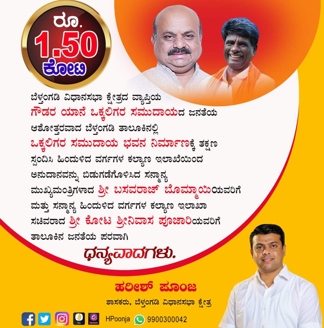 ಬೆಳ್ತಂಗಡಿ ತಾಲೂಕಿನಲ್ಲಿ ಒಕ್ಕಲಿಗರ ಸಮುದಾಯ ಭವನ ನಿರ್ಮಿಸುವ ಕುರಿತು ಶಾಸಕ ಹರೀಶ್ ಪೂಂಜಾರವರು ಸಲ್ಲಿಸಿದ್ದ ಮನವಿಗೆ ಸ್ಪಂದಿಸಿ, ಅನುದಾನ ಬಿಡುಗಡೆಗೊಳಿಸಿದ ಮುಖ್ಯಮಂತ್ರಿ ಬಸವರಾಜ್ ಬೊಮ್ಮಾಯಿ- ಕಹಳೆ ನ್ಯೂಸ್