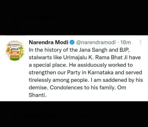 ಮಾಜಿ ಶಾಸಕ ಉರಿಮಜಲು ರಾಮ್ ಭಟ್ ಅವರ ನಿಧನಕ್ಕೆ ಸಂತಾಪ ಸೂಚಿಸಿದ ಪ್ರಧಾನಿ ನರೇಂದ್ರ ಮೋದಿ- ಕಹಳೆ ನ್ಯೂಸ್