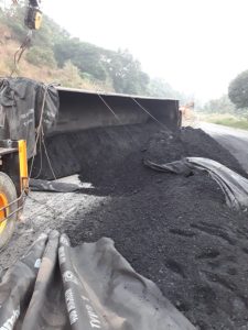 ಬಂಟ್ವಾಳ: ಮಂಗಳೂರು ಬಂದರಿನಿಂದ ಕಲ್ಲಿದ್ದಲು ತುಂಬಿಸಿದ ಲಾರಿ ಬಳ್ಳಾರಿ ಕಡೆಗೆ ಸಾಗುತ್ತಿದ್ದ ಕಲ್ಲಿದ್ದಲು ಸಾಗಾಟದ ಲಾರಿಯೊಂದು ಚಾಲಕನ ನಿಯಂತ್ರಣ ಕಳೆದುಕೊಂಡು ರಸ್ತೆ ಮಧ್ಯೆ ಪಲ್ಟಿಯಾದ ಘಟನೆ ತುಂಬೆ ಎಂಬಲ್ಲಿ ಬುಧವಾರ ಮಧ್ಯರಾತ್ರಿ ವೇಳೆ ನಡೆದಿದೆ.