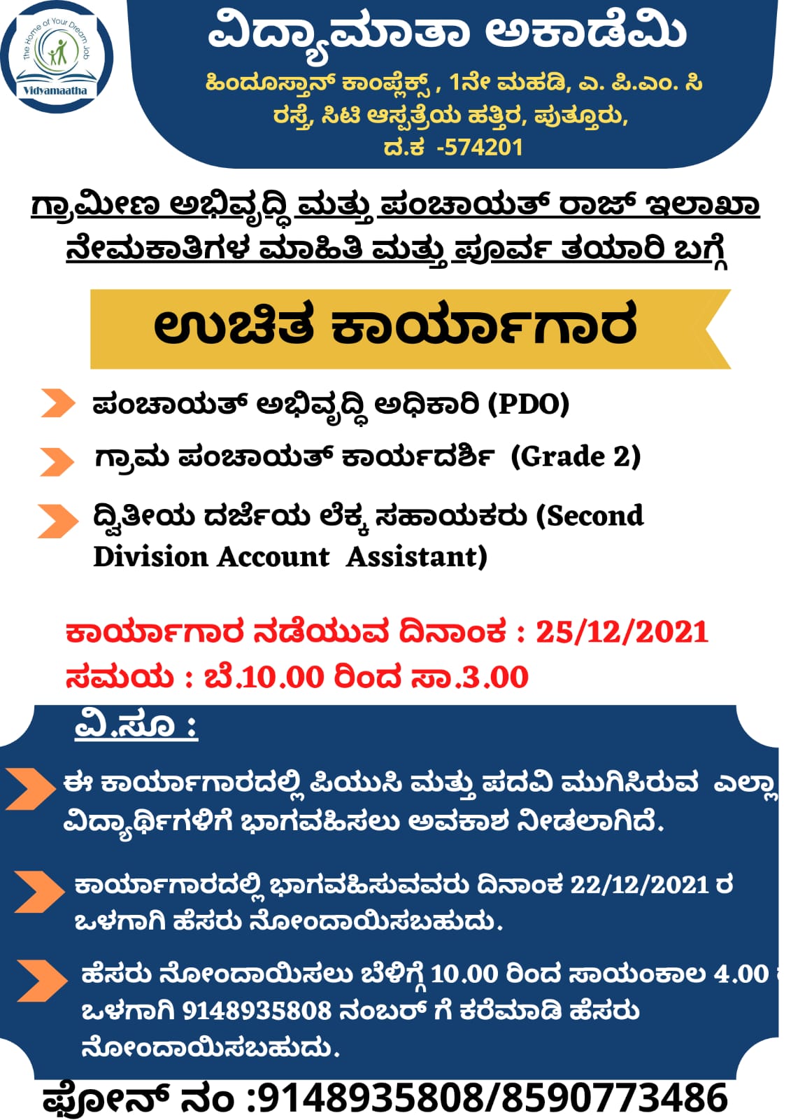ಈ ಕಾರ್ಯಾಗಾರದಲ್ಲಿ ಪಿ.ಯು.ಸಿ ಮತ್ತು ಪದವಿ ಮುಗಿಸಿರುವ ಎಲ್ಲಾ ವಿದ್ಯಾರ್ಥಿಗಳು ಭಾಗವಹಿಸಲು ಅವಕಾಶವನ್ನು ನೀಡಲಾಗಿದ್ದು, ಈ ಕಾರ್ಯಾಗಾರಕ್ಕೆ ವಿದ್ಯಾಮಾತಾ ಅಕಾಡೆಮಿಯಲ್ಲಿ ಹೆಸರು ನೋಂದಾಯಿಸಲು ಬೆಳಿಗ್ಗೆ 10.00 ರಿಂದ ಸಾಯಂಕಾಲ 4.00ರ ನಡುವೆ 9148935808 ಈ ನಂಬರ್ ಗೆ ಕರೆ ಮಾಡಿ ಹೆಸರು ನೋಂದಾಯಿಸಲು ಅವಕಾಶ ನೀಡಲಾಗಿದೆ /ಈ ಕೆಳಗಿನ ವಿಳಾಸದಲ್ಲಿ ಖುದ್ದಾಗಿ ಹೆಸರನ್ನು ದಿನಾಂಕ 22.12.2021ರ ಒಳಗಾಗಿ ನೋಂದಾಯಿಸಿಕೊಳ್ಳಬಹುದು.