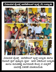 ವಿನಾಯಕ ಫ್ರೆಂಡ್ಸ್ ಚಾರಿಟೇಬಲ್ ಟ್ರಸ್ಟ್ (ರಿ) ಬಲ್ನಾಡ್ ಹಾಗೂ ರೋಟರಿ ಕ್ಲಬ್ ಪುತ್ತೂರು ಸ್ವರ್ಣ ಇದರ ವತಿಯಿಂದ ಬಲ್ನಾಡು ಹಾಗೂ ಕುರುಡಕಟ್ಟೆ ಅಂಗನವಾಡಿ ಕೇಂದ್ರದ ಮಕ್ಕಳಿಗೆ ಪಾದರಕ್ಷೆ ವಿತರಣೆ ಮಾಡಲಾಯಿತು.