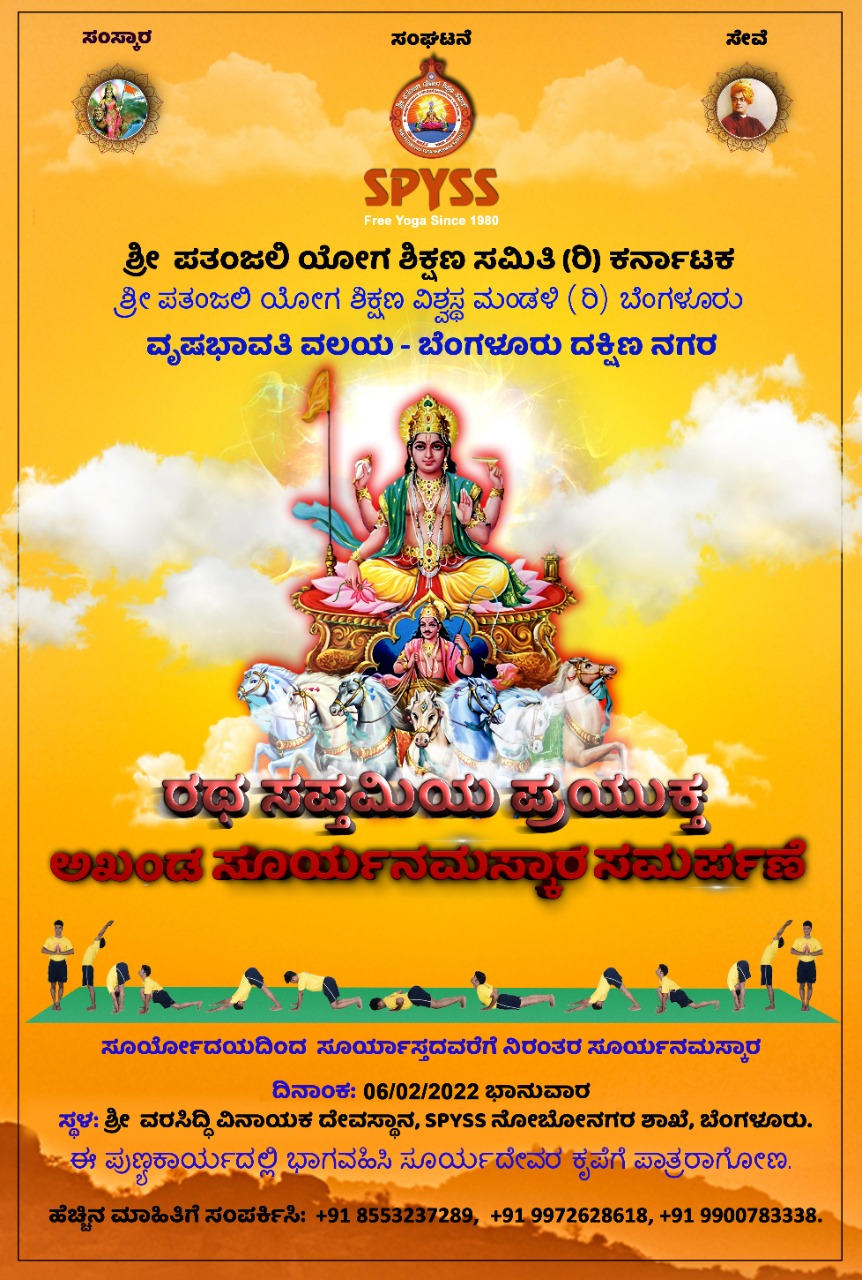 ಬೆಂಗಳೂರು: ಲೋಕ ಕಲ್ಯಾಣಗೋಸ್ಕರ ಹಾಗೂ ಮಹಾಮಾರಿ ಕೊರೋನಾ ನಿವಾರಣೆಗೋಸ್ಕರ ಶ್ರೀ ಪತಂಜಲಿ ಯೋಗ ಶಿಕ್ಷಣ ಸಮಿತಿ (ರಿ) ಕರ್ನಾಟಕ, ಶ್ರೀ ಪತಂಜಲಿ ಯೋಗ ಶಿಕ್ಷಣ ವಿಶ್ವಸ್ಥ ಮಂಡಳಿ (ರಿ)ಬೆಂಗಳೂರು ವತಿಯಿಂದ ವೃಷಭಾವತಿ ವಲಯ ಬೆಂಗಳೂರು ದಕ್ಷಿಣ ನಗರ ರಥ ಸಪ್ತಮಿಯ ಪ್ರಯುಕ್ತ ಅಖಂಡ ಸೂರ್ಯನಮಸ್ಕಾರ ಸಮರ್ಪಣೆ ಕಾರ್ಯಕ್ರಮವು ಬೆಂಗಳೂರು spyss ನೋಬೋ ನಗರ ಶಾಖೆಯ ಶ್ರೀ ವರಸಿದ್ಧಿವಿನಾಯಕ ದೇವಸ್ಥಾನದಲ್ಲಿ ಫೆ.06ರಂದು ಸೂರ್ಯೋದಯದಿಂದ ಸೂರ್ಯಸ್ತದವರೆಗೆ ನಿರಂತರ ಸೂರ್ಯ ನಮಸ್ಕಾರ ನಡೆಯಲಿದೆ.