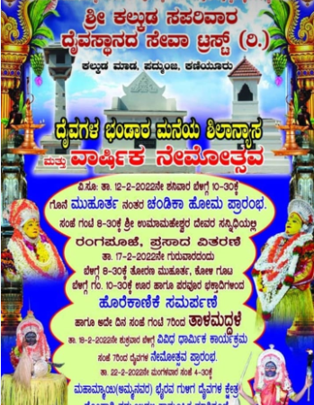 ಕಣಿಯೂರು : ಶ್ರೀ ಕಲ್ಕುಡ ಸಪರಿವಾರ ದೈವಸ್ಥಾನದ ಸೇವಾ ಟ್ರಸ್ಟ್ (ರಿ.) ಕಲ್ಕುಡ ಮಾಡ, ಪದ್ಮುಂಜ, ಕಣಿಯೂರು ದೈವಗಳ ಭಂಡಾರ ಮನೆಯ ಶಿಲಾನ್ಯಾಸ ಮತ್ತು ವಾರ್ಷಿಕ ನೇಮೋತ್ಸವದ ವಿವಿಧ ಧಾರ್ಮಿಕ ಕಾರ್ಯಕ್ರಮಗಳು ಫೆ. 12ರಿಂದ ಪ್ರಾರಂಭವಾಗಿದೆ.