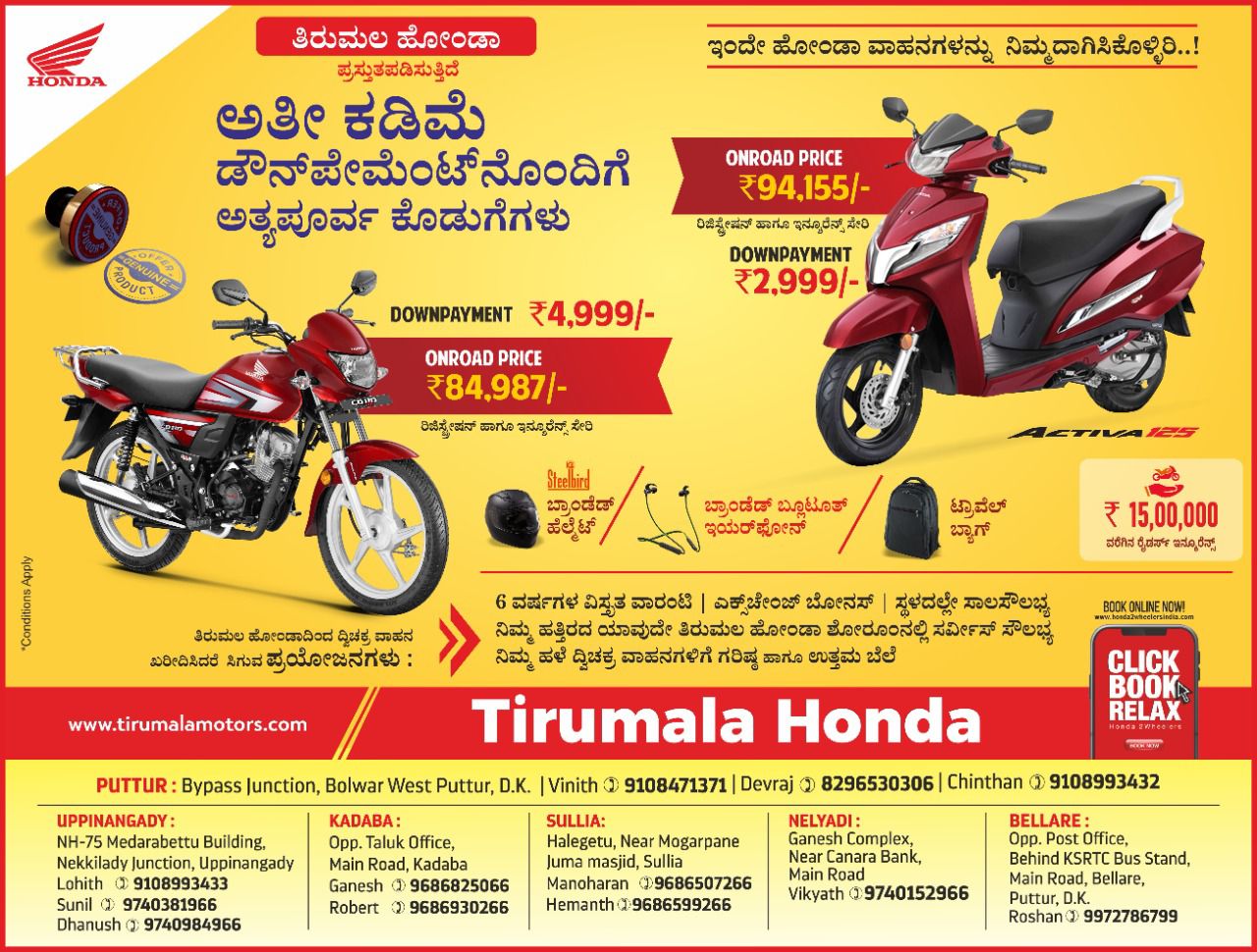 ಪುತ್ತೂರು: ತಿರುಮಲ ಹೋಂಡಾದಲ್ಲಿ ಗ್ರಾಹಕರಿಗೆ ಭರ್ಜರಿ ಆಫರ್ಗಳು ಸಿದ್ಧವಾಗಿದೆ. ಅತೀ ಕಡಿಮೆ ಡೌನ್ಪೇಮೆಂಟ್ನೊಂದಿಗೆ ಅತ್ಯಪೂರ್ವ ಕೊಡುಗೆಗಳನ್ನು ನಿಮ್ಮದಾಗಿಸಿಕೊಳ್ಳುವ ಸುವರ್ಣವಕಾಶ ಒದಗಿ ಬಂದಿದೆ. 94,155 ಆನ್ರೋಡ್ ಪ್ರೈಸ್ನ ಟುವೀಲರ್ ಖರೀದಿಸಲು, ರಿಜಿಸ್ಟರೇಷನ್ ಹಾಗೂ ಇನ್ಸೂರೆನ್ಸ್ ಸೇರಿ ಕೇವಲ 2,999 ರೂಪಾಯಿ ಡೌನ್ಪೇಮೆಂಟ್ ಮಾಡಿದ್ರೆ ಆಯ್ತು. ಇನ್ನು 4,999 ರೂಪಾಯಿ ಡೌನ್ ಪೇಮೆಂಟ್ ಮಾಡಿದ್ರೆ , 84,987 ರೂಪಾಯಿ ಮೌಲ್ಯದ ಟುವೀಲರ್ನ್ನು ನೀವು ಖರೀದಿಸ್ಬಹುದು. ಈ ಖರೀದಿಗಳ ಮೇಲೆ ಬ್ರಾಂಡೆಡ್ ಹೆಲ್ಮೆಟ್, ಬ್ರಾಂಡೆಡ್ ಬ್ಲೂಟೂತ್ ಇಯರ್ ಫೋನ್, ಟ್ರಾವೆಲ್ ಬ್ಯಾಗ್, ಜೊತೆಗೆ 15 ಲಕ್ಷದವರೆಗೆ ರೈರ್ಸ್ ಇನ್ಸೂರೆನ್ಸ್ನ ಸೌಲಭ್ಯ ಗ್ರಾಹಕರಿಗೆ ಸಿಕ್ತಾ ಇದೆ. ತಿರುಮಲ ಹೋಂಡಾದಲ್ಲಿ ವಾಹನ ಖರೀದಿಸುವ ಗ್ರಾಹಕರಿಗೆ ಇರುವ ಲಾಭ ಏನಪ್ಪ ಅಂದ್ರೆ, ಇಲ್ಲಿ 6 ವರ್ಷಗಳ ವಿಸೃತ ವಾರೆಂಟಿ, ಎಕ್ಸ್ಚೇಂಜ್ ಬೋನಸ್, ಸ್ಥಳದಲ್ಲೇ ಸಾಲ ಸೌಲಭ್ಯ ಇದೆ. ಜೊತೆಗೆ ನಿಮ್ಮ ಹಳೆದ್ವಿಚಕ್ರ ವಾಹನಗಳಿಗೆ ಇಲ್ಲಿ ಗರಿಷ್ಟ ಹಾಗೂ ಉತ್ತಮ ಬೆಲೆಗೆ ಸಿಗುತ್ತೆ. ಇನ್ನೂ ಈ ಎಲ್ಲಾ ಆಫರ್ ಗಳು ಪುತ್ತೂರು, ಉಪ್ಪಿನಂಗಡಿ, ಕಡಬ, ಸುಳ್ಯ, ನೆಲ್ಯಾಡಿ, ಬೆಳ್ಳಾರೆಯಲ್ಲಿ ಗ್ರಾಹಕರಿಗಾಗಿ ಕಾಯ್ತ ಇದೆ.