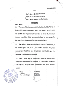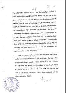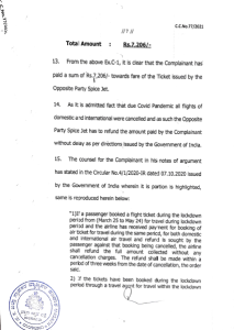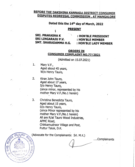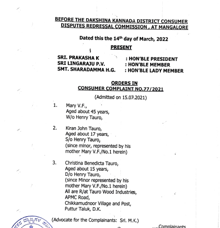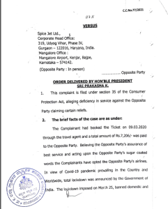 ಮಂಗಳೂರು: ಪುತ್ತೂರಿನ ಮೇರಿ ಮತ್ತು ಅವರ ಇಬ್ಬರು ಮಕ್ಕಳು ಬೆಂಗಳೂರಿಗೆ ಹೋಗುವರೇ ಏಜೆಂಟ್ ಮುಖಾಂತರ ಸ್ಪೈಸ್ ಜೆಟ್ ಲಿಮಿಟೆಡ್ ಸಂಸ್ಥೆಯ ವಿಮಾನದಲ್ಲಿ ಟಿಕೆಟ್ ಬುಕ್ ಮಾಡಿದ್ದರು, ಆದರೆ ಸದ್ರಿ ಸಂದರ್ಭ ಅವರು ಪ್ರಯಾಣವನ್ನು ನಿಗದಿಗೊಳಿಸಿದ ಸಂದರ್ಭದಲ್ಲಿ ಕೋವಿಡ್ ಕಾರಣದಿಂದ ವಿಮಾನಯಾನ ಪ್ರಯಾಣ ರದ್ದಾಗಿತ್ತು. ಕೋವಿಡ್-19 ಲಾಕ್ ಡೌನ್ ಕಾರಣದಿಂದ ಪ್ರಯಾಣ ರದ್ದಾದ ಕಾರಣ ಅದರ ಪ್ರಯಾಣದ ವೆಚ್ಚವನ್ನು ಸ್ಪೈಸ್ ಜೆಟ್ ಲಿಮಿಟೆಡ್ ಮರುಪಾವತಿ ಮಾಡಬೇಕಾಗಿತ್ತು, ಗ್ರಾಹಕರು ಹಲವಾರು ಬಾರಿ ಕೋರಿಕೊಂಡರೂ ವಿಮಾನ ಯಾನ ಸಂಸ್ಥೆ ಹಣವನ್ನು ಮರುಪಾವತಿಸಲಿಲ್ಲ ಬದಲಿಗೆ ವಿಮಾನಯಾನ ಸಂಸ್ಟೆಯವರು ಅದನ್ನು ಸರ್ವೋಚ್ಚ ನ್ಯಾಯಾಲಯ, ವಾಯುಯಾನ ಸಂಸ್ಟೆಯವರು ರಿ ಶೆಡ್ಯೂಲ್ ಮಾಡಲು ಹೇಳಿರುತ್ತಾರೆ ಹಾಗಾಗಿ ಅದನ್ನು ಒಂದು ವರ್ಷದ ಒಳಗೆ ಅದೇ ಸೌಲಭ್ಯವನ್ನು ಬೇರೆ ಕಡೆಗೆ ಹೋಗುವುದಿದ್ದರೂ ಪಡೆದುಕೊಳ್ಳಬಹುದು ಎಂದು ಹೇಳಿದ್ದಾರೆಯೇ ಹೊರತು ಯಾವುದೇ ಹಣವನ್ನು ಹಿಂತುರಿಗಿಸಲಿಲ್ಲ. ಹಲವಾರು ಬಾರಿ ಮನವಿ ಕೊಟ್ಟರೂ ಗಣನೆಗೆ ತೆಗೆದುಕೊಂಡಿರುವುದಿಲ್ಲ .ತದನಂತರ ವಕೀಲರ ಮುಖಾಂತರ ನೋಟಿಸ್ ಕೊಟ್ಟಾಗಳೂ ಅದಕ್ಕೆ ಸರಿಯಾಗಿ ಸ್ಪಂದಿಸಿರುವುದಿಲ್ಲ.