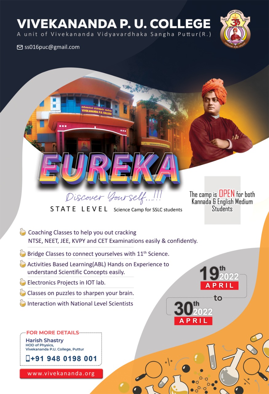 ಪುತ್ತೂರು: ಹತ್ತನೇ ತರಗತಿ ಪರೀಕ್ಷೆ ಬರೆದು ಪ್ರಥಮ ಪಿ.ಯು.ಸಿ. ಯಲ್ಲಿ ವಿಜ್ಞಾನ ವಿಷಯ ಆಯ್ಕೆ ಮಾಡ ಬಯಸುವ ವಿದ್ಯಾರ್ಥಿಗಳಿಗಾಗಿ ಹನ್ನೆರಡು ದಿನಗಳ ರಾಜ್ಯ ಮಟ್ಟದ ವಿಜ್ಞಾನ ಶಿಬಿರ ಯುರೇಕಾ -2022 ವಿವೇಕಾನಂದ ಪದವಿ ಪೂರ್ವ ಕಾಲೇಜಿನಲ್ಲಿ ನಡೆಯಲಿದೆ. ಎಪ್ರಿಲ್ 19 ರಿಂದ 30 ರವರೆಗೆ ನಡೆಯಲಿರುವ ಈ ಶಿಬಿರವು ವಿದ್ಯಾರ್ಥಿಗಳನ್ನು ತಮ್ಮ ಮುಂದಿನ ಪಿ.ಯು.ಸಿ. ವಿಜ್ಞಾನ ವಿಷಯಗಳ ಅಧ್ಯಯನಕ್ಕೆ ಮಾನಸಿಕವಾಗಿ ಸಿದ್ಧಗೊಳಿಸುವ ಉದ್ದೇಶ ಹೊಂದಿದೆ. ಪ್ರಸಕ್ತ ಎಸ್ಎಸ್ಎಲ್ಸಿ ಪರೀಕ್ಷೆಯನ್ನು ಬರೆಯುತ್ತಿರುವ ಕನ್ನಡ ಮತ್ತು ಇಂಗ್ಲೀಷ್ ಎರಡೂ ಮಾಧ್ಯಮದ ವಿದ್ಯಾರ್ಥಿಗಳಿಗೆ ಈ ಕಾರ್ಯಕ್ರಮದಲ್ಲಿ ಪ್ರವೇಶಾವಕಾಶವಿದೆ.