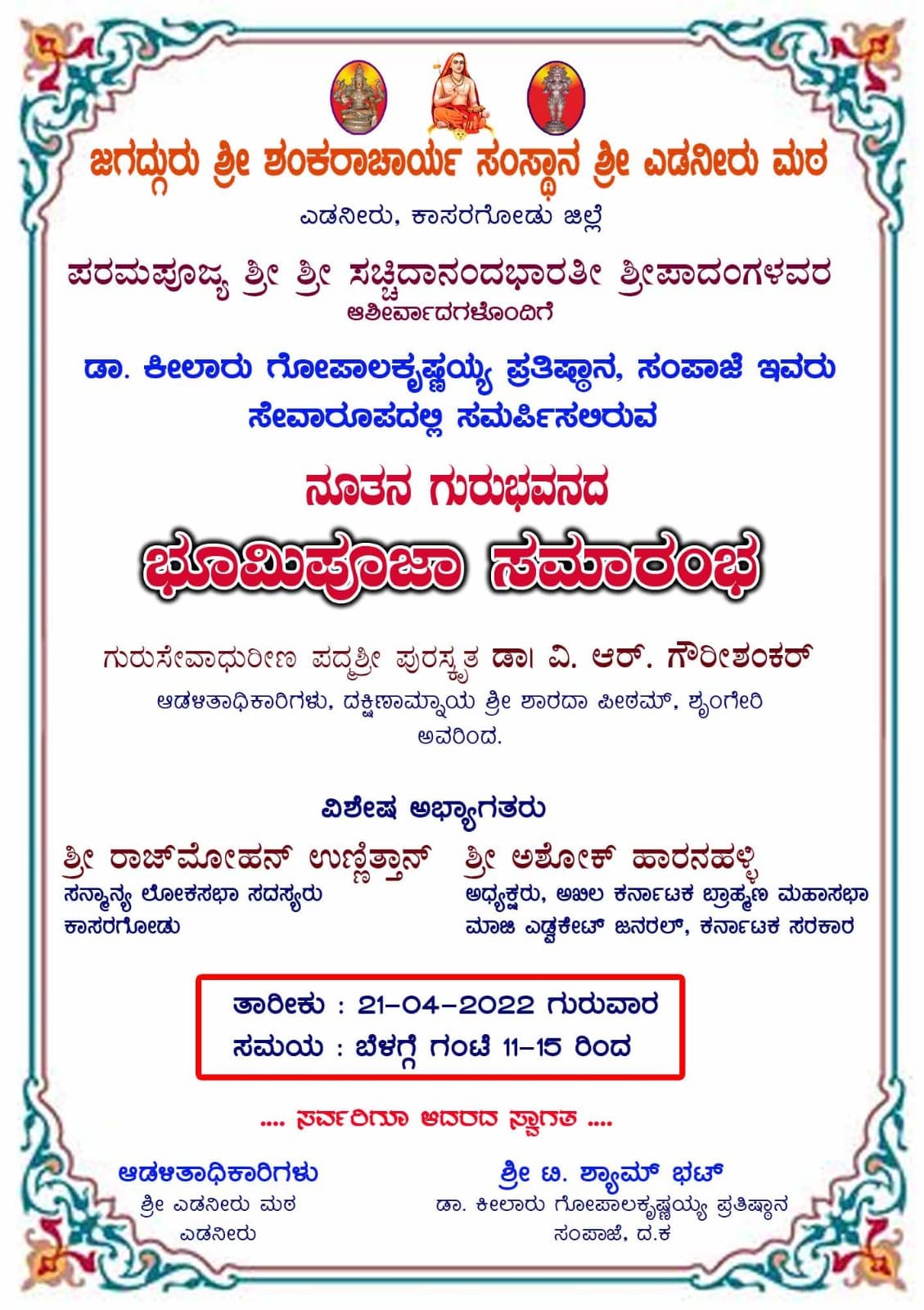 ಕಾರ್ಯಕ್ರಮದಲ್ಲಿ ಕಾಸರಗೋಡಿನ ಲೋಕಸಭಾ ಸದಸ್ಯರಾದ ಶ್ರೀ ರಾಜ್ಮೋಹನ್ ಉಣ್ಣಿತ್ತಾನ್, ಅಖಿಲ ಕರ್ನಾಟಕ ಬ್ರಾಹ್ಮಣ ಮಹಾಸಭಾ ಅಧ್ಯಕ್ಷರು, ಹಾಗೂ ಕರ್ನಾಟಕ ಸರಕಾರ ಮಾಜಿ ಎಡ್ವಕೇಟ್ ಜನರಲ್ ಆಗಿರುವ ಅಶೋಕ್ ಹಾರನಹಳ್ಳಿ ಭಾಗವಹಿಸಲಿದ್ದಾರೆ.