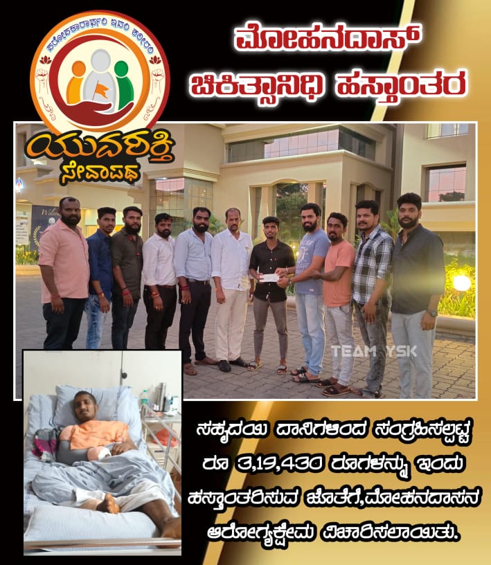 ಕಲ್ಲಡ್ಕದಲ್ಲಿ ರಸ್ತೆ ಅಪಘಾತಕ್ಕೆ ಒಳಗಾಗಿ, ಮಂಗಳೂರಿನ ಎ.ಜೆ ಆಸ್ಪತ್ರೆಯಲ್ಲಿ ಚಿಕಿತ್ಸೆ ಪಡೆಯುತ್ತಿರುವ 19 ವರ್ಷದ ಮೋಹನ್ ದಾಸ್ ರವರ ಚಿಕಿತ್ಸಾ ವೆಚ್ಚಕ್ಕಾಗಿ ಯುವಶಕ್ತಿ ಸೇವಾಪಥದ ವತಿಯಿಂದ ಹಮ್ಮಿಕೊಂಡಿದ್ದ ಸೇವಾನಿಧಿ ಯೋಜನೆಯು ಸಂಪನ್ನಗೊಂಡಿದೆ.