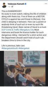 ಪ್ರಯಾಣದ ಮೂಲಭೂತ ಪ್ರಜ್ಞೆಯು ಅತ್ಯಗತ್ಯವಾಗಿರುತ್ತದೆ . ಈ ವಿಚಾರದಲ್ಲಿ ಡಿಸಿಪಿ ಅಪರಾಧ ಮತ್ತು ಸಂಚಾರ ಮಂಗಳೂರು ನಗರ ಪೊಲೀಸರು ಮಧ್ಯಪ್ರವೇಶಿಸಬೇಕು. ಇಂತಹ ಅಪಾಯಕಾರಿ ಸವಾರಿಗಾಗಿ ಪರವಾನಗಿ ಹೊಂದಿರುವವರನ್ನು ಬುಕ್ ಮಾಡಿ ಕಟ್ಟುನಿಟ್ಟಿನ ಕ್ರಮಕ್ಕೆ ನಾನು ಒತ್ತಾಯಿಸುತ್ತೇನೆ ಮತ್ತು ಇಲಾಖೆಯು ನಗರದಲ್ಲಿ ಕಾಲಕಾಲಕ್ಕೆ ಈ ರೀತಿ ನಿಯಮ ಉಲ್ಲಂಘಿಸುವವರ ವಿರುದ್ಧ ಕ್ರಮ ಕೈಗೊಳ್ಳಬೇಕು. ಜೀವನ ಅಮೂಲ್ಯವಾಗಿದೆ, ಕಾಳಜಿ ವಹಿಸಿ, “ಎಂದು ಸಾಮಾಜಿಕ ಜಾಲತಾಣದಲ್ಲಿ ವಿಡಿಯೋ ಶೇರ್ ಮಾಡಿದ್ದಾರೆ.