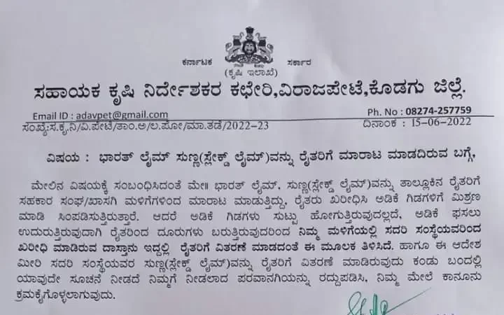 ಇದ್ದರಿಂದ ಈ ಸುಣ್ಣವನ್ನು ಬೆಳೆಗಾರರು ಬಳಸದಂತೆ ಎಚ್ಚರವಹಿಸಬೇಕು ಎಂದು ಕೃಷಿ ಇಲಾಖೆ ತುರ್ತು ಆದೇಶ ಹೊರಡಿಸಿದ್ದು, ಈ ಬ್ರಾಂಡ್ ನ ಸುಣ್ಣ ಬಳಸದಂತೆ ಮತ್ತು ಏಜೆನ್ಸಿ ಅವರು ಮಾರಟ ಮಾಡದಂತೆ ಪ್ರಕಟಣೆ ಮೂಲಕ ತಿಳಿಸಿದೆ