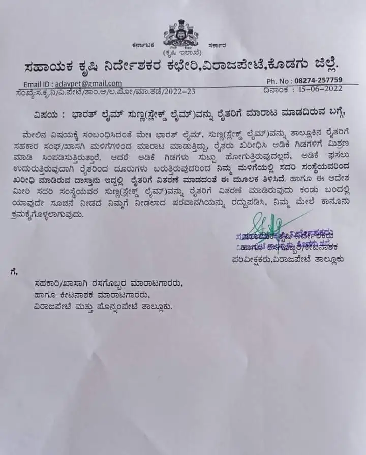 ಇದ್ದರಿಂದ ಈ ಸುಣ್ಣವನ್ನು ಬೆಳೆಗಾರರು ಬಳಸದಂತೆ ಎಚ್ಚರವಹಿಸಬೇಕು ಎಂದು ಕೃಷಿ ಇಲಾಖೆ ತುರ್ತು ಆದೇಶ ಹೊರಡಿಸಿದ್ದು, ಈ ಬ್ರಾಂಡ್ ನ ಸುಣ್ಣ ಬಳಸದಂತೆ ಮತ್ತು ಏಜೆನ್ಸಿ ಅವರು ಮಾರಟ ಮಾಡದಂತೆ ಪ್ರಕಟಣೆ ಮೂಲಕ ತಿಳಿಸಿದೆ