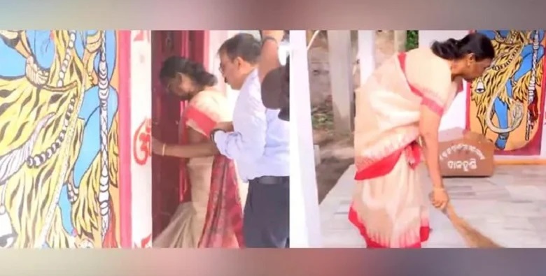 ದ್ರೌಪದಿ ಮುರ್ಮು ಅವರು ತಮ್ಮ ತವರು ರಾಜ್ಯವಾದ ಒಡಿಶಾದ ಮಯೂರ್ಭಂಜ್ ಜಿಲ್ಲೆಯ ರಾಯರಂಗ್ಪುರದಲ್ಲಿರುವ ಶಿವನ ದೇವಾಲಯಕ್ಕೆ ಇಂದು ಭೇಟಿ ಕೊಟ್ಟಿದ್ದಾರೆ. ಈ ವೇಳೆ ದೇವರಿಗೆ ಪ್ರಾರ್ಥನೆ ಸಲ್ಲಿಸುವ ಮೊದಲು ದೇವಾಲಯದ ನೆಲವನ್ನು ಗುಡಿಸಿದ್ದಾರೆ. ಪ್ರಸ್ತುತ ಈ ವೀಡಿಯೋ ಸೋಶಿಯಲ್ ಮೀಡಿಯಾದಲ್ಲಿ ಹರಿದಾಡುತ್ತಿದೆ.