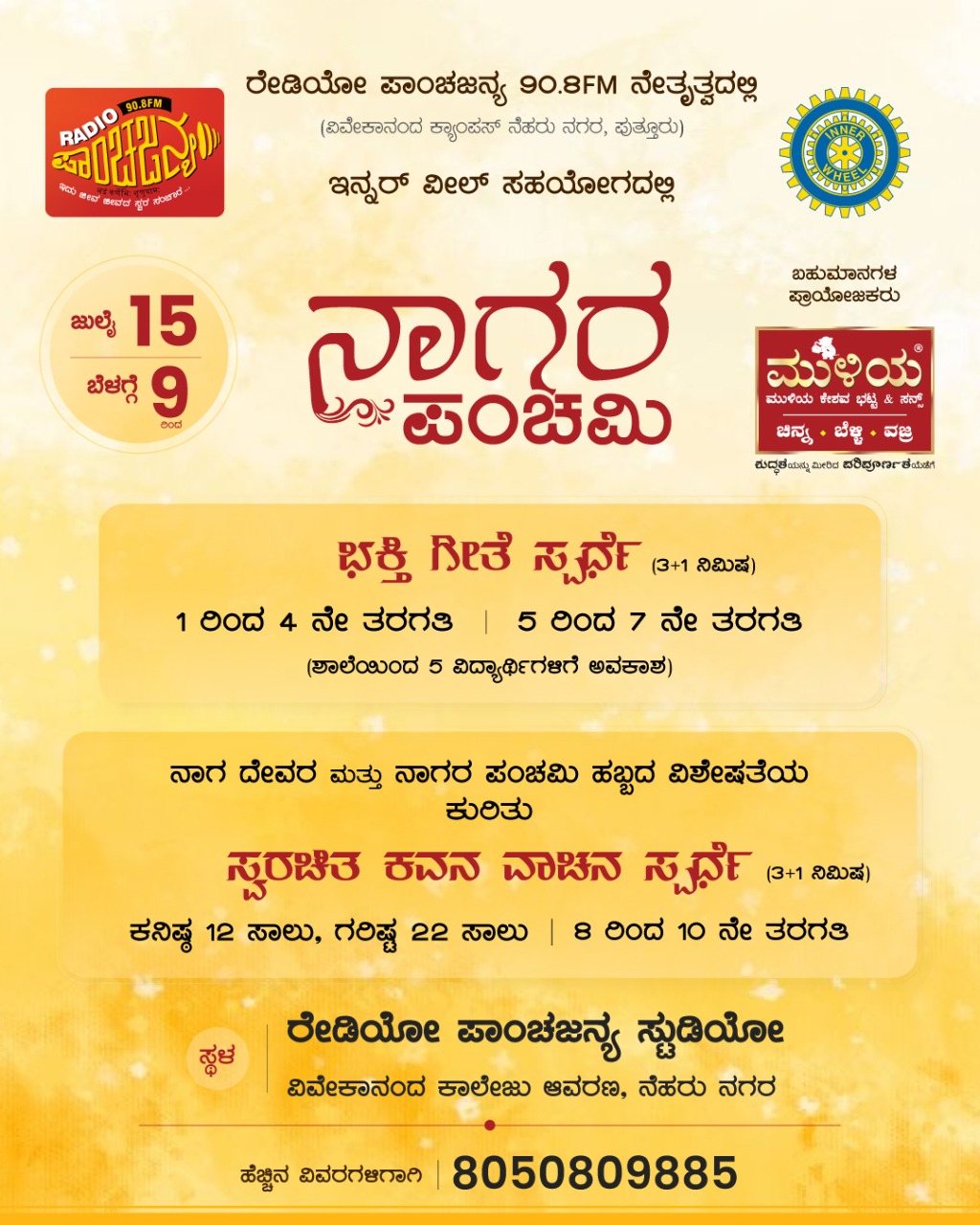 ಪುತ್ತೂರು: ಸಮುದಾಯ ಬಾನುಲಿ ರೇಡಿಯೋ ಪಾಂಚಜನ್ಯ 90.8 ಎಫ್ಎಂ ಇನ್ನರ್ ವೀಲ್ ಮತ್ತು ಮುಳಿಯ ಜ್ಯುವೆಲ್ಸ್ ಸಹಯೋಗದಲ್ಲಿ ಜುಲೈ 15ರಂದು ಬೆಳಗ್ಗೆ 9 ಗಂಟೆಗೆ ನಾಗರ ಪಂಚಮಿ ಪ್ರಯುಕ್ತ ವಿಶೇಷ ಭಕ್ತಿಗೀತೆ ಸ್ಪರ್ಧೆಯನ್ನು ಪ್ರಾಥಮಿಕ ಶಾಲಾ ಮಕ್ಕಳಿಗಾಗಿ ಆಯೋಜಿಸಿದೆ.