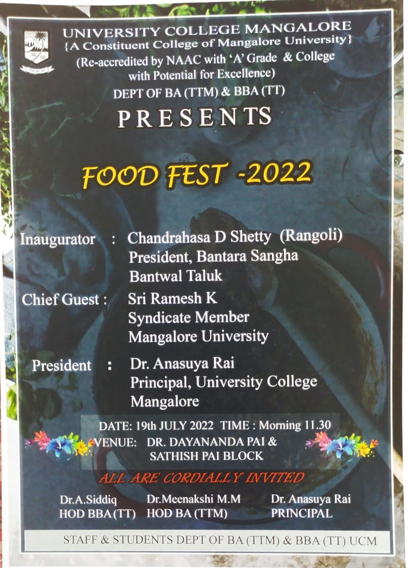 ಮಂಗಳೂರು: ವಿಶ್ವವಿದ್ಯಾನಿಲಯ ಕಾಲೇಜಿನ ಪ್ರವಾಸೋದ್ಯಮ ವಿಭಾಗ ಹಾಗೂ ಬಿಬಿಎ (ಟೂರಿಸಂ ಅಂಡ್ ಟ್ರಾವೆಲ್) ವಿಭಾಗದ ವತಿಯಿಂದ ಜು.19ರಂದು ಆಹಾರೋತ್ಸವವನ್ನು ಹಮ್ಮಿಕೊಳ್ಳಲಾಗಿದೆ.
