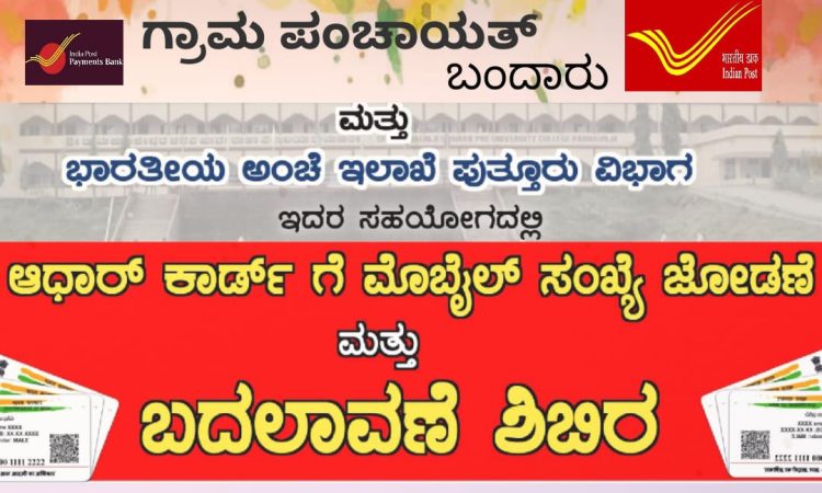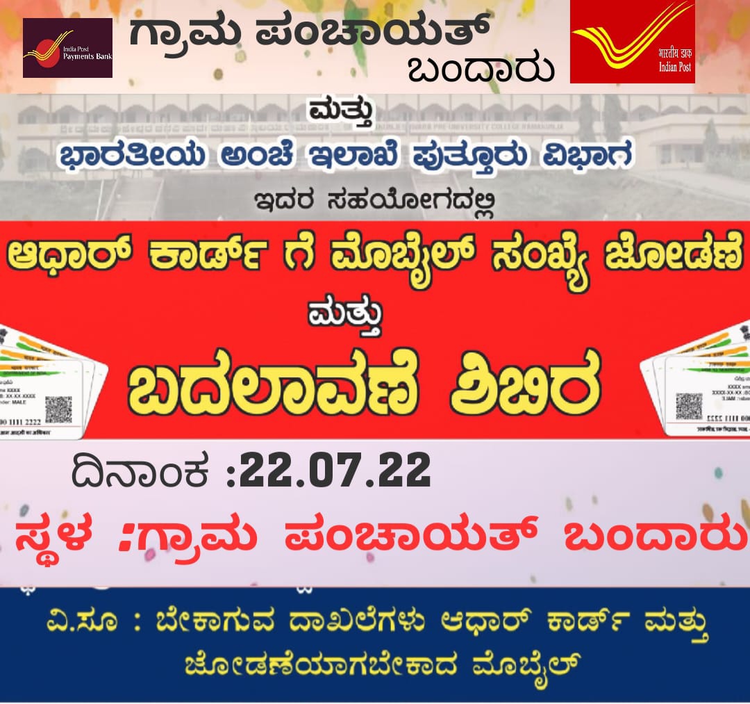 ಆಧಾರ್ ಕಾರ್ಡ್ ಗೆ ಮೊಬೈಲ್ ಸಂಖ್ಯೆ ಜೋಡನೆ ಮತ್ತು ಬದಲಾವಣೆ (ತಿದ್ದುಪಡಿ )ಶಿಬಿರ ದಿನಾಂಕ :22/07/2022. ಶುಕ್ರವಾರ, ಸಮಯ :ಬೆಳಗ್ಗೆ 9.30 ರಿಂದ ಮಧ್ಯಾಹ್ನ ದವರೆಗೆ ಬಂದಾರು ಗ್ರಾಮ ಪಂಚಾಯತ್ ಬಂದಾರು ಕಛೇರಿ ನಡೆಯಲಿದ್ದು ಗ್ರಾಮಸ್ಥರು ಇದರ ಸದುಪಯೋಗ ಪಡೆದು ಕೊಳ್ಳಬೇಕಾಗಿ ಗ್ರಾಮ ಪಂಚಾಯತ್ ಅಧ್ಯಕ್ಷರಾದ ಪರಮೇಶ್ವರಿ ಕೆ ಗೌಡ ಹಾಗೂ ಪಂಚಾಯತ್ ಅಭಿವೃದ್ಧಿ ಅಧಿಕಾರಿ ಮೋಹನ್ ಬಂಗೇರ ತಿಳಿಸುರುತ್ತಾರೆ.