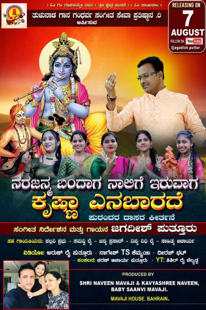 ತುಳುನಾಡ ಗಾನ ಗಂಧರ್ವ ಸಂಗೀತ ಸೇವಾ ಪ್ರತಿಷ್ಠಾನ .ರಿ ಅರ್ಪಿಸುವ ನರಜನ್ಮ ಬಂದಾಗ ನಾಲಿಗೆ ಇರುವಾಗ ಕೃಷ್ಣ ಎನಬಾರದೆ ಎಂಬ ಪುರಂದರ ದಾಸರ ಕಿರ್ತನೆಗೆ ಪುತ್ತೂರು ಜಗದೀಶ್ ಆಚಾರ್ಯ ಸಂಗೀತ ನಿರ್ದೇಶನ ಮತ್ತು ಗಾಯನದ ಮೂಲಕ ಈ ಹಾಡು ಹೊರಹೊಮ್ಮಿದ್ದು, ಆಗಸ್ಟ್ ೭ ರಂದು ಬಿಡುಗಡೆಗೊಳ್ಳಲಿದೆ. ಇನ್ನು ಈ ಹಾಡಿನಲ್ಲಿ ಪುತ್ತೂರಿನ ಹೆಸರಾಂತ ಗಾಯಕಿಯರಾದ ಸಮನ್ವಿ ರೈ, ಜನ್ಯ ಪ್ರಸಾದ್, ದಿವ್ಯ ನಿಧಿ ರೈ, ಸಾಹಿತ್ಯ ಆಚಾರ್ಯ ಸಹ ಗಾಯಕಿಯರಾಗಿ ತಮ್ಮ ಅಧ್ಬುತ ಕಂಠದ ಮೂಲಕ ಹಾಡಿಗೆ ವಿಶೇಷ ಮೆರುಗು ತುಂಬಿದ್ದಾರೆ.