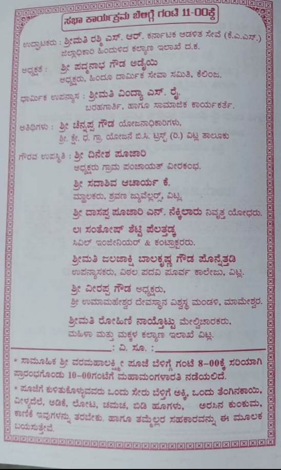 ಹಿಂದುಳಿದ ಕಲ್ಯಾಣ ಇಲಾಖೆಯ ದಕ್ಷಿಣ ಕನ್ನಡ ಇದರ ಜಿಲ್ಲಾಧಿಕಾರಿಯಾಗಿರುವ ರಶ್ಮಿ ಎಸ್.ಆರ್ ಕಾರ್ಯಕ್ರಮದ ಉದ್ಘಾಟನೆಯನ್ನು ಮಾಡಲಿದ್ದು, ಧಾರ್ಮಿಕ ಉಪಾನ್ಯಾಸಕರಾಗಿ ಖ್ಯಾತ ಬರಹಗಾರ್ತಿ ಸಮಾಜ ಸೇವಕಿ ವಿಂದ್ಯಾ ಎಸ್ ರೈ ಭಾಗವಹಿಸಲಿದ್ದಾರೆ.
