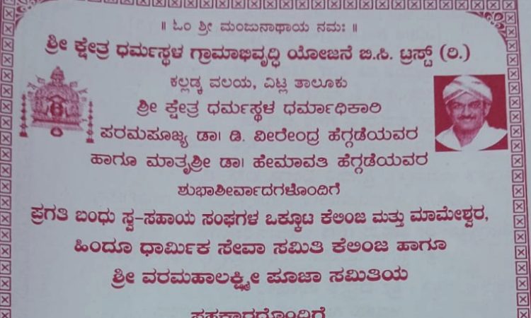 ವಿಟ್ಲ: ಶ್ರೀ ಕ್ಷೇತ್ರ ಧರ್ಮಸ್ಥಳ ಗ್ರಾಮ ಅಭಿವೃದ್ಧಿ ಯೋಜನೆ ಬಿ ಸಿ ಟ್ರಸ್ಟ್( ರಿ) ವಿಟ್ಲ ಇದರ ಕಾರ್ಯ ಕ್ಷೇತ್ರ ವ್ಯಾಪ್ತಿಯ ಕಲ್ಲಡ್ಕ ವಲಯದ ಪ್ರಗತಿ ಬಂದು ಸ್ವ-ಸಹಾಯ ಸಂಘಗಳ ಒಕ್ಕೂಟ ಕೆಲಿಂಜ ಹಾಗೂ ಮಾಮೇಶ್ವರ, ಹಿಂದೂ ಧಾರ್ಮಿಕ ಸೇವಾ ಸಮಿತಿ ಕೆಲಿಂಜ, ವರಮಹಾಲಕ್ಷ್ಮಿ ಪೂಜಾ ಸಮಿತಿ ಇದರ ಜಂಟಿ ಆಶ್ರಯದಲಿ,್ಲ ಸಾಮೂಹಿಕ ಶ್ರೀ ವರಮಹಾಲಕ್ಷ್ಮಿ ಪೂಜೆ ಹಾಗೂ ಜ್ಞಾನವಿಕಾಸ ಕೇಂದ್ರಗಳ ವಾರ್ಷಿಕೋತ್ಸವ ಕಾರ್ಯಕ್ರಮ ಹಿಂದೂ ಧಾರ್ಮಿಕ ಸೇವಾ ಸಮಿತಿ ಕೆಲಿಂಜ ಇದರ ಅಧ್ಯಕ್ಷರಾದ ಶ್ರೀಯುತ ಪದ್ಮನಾಭ ಗೌಡ ಅಢೈಯಿ ಇವರ ಅಧ್ಯಕ್ಷತೆಯಲ್ಲಿ ಆ.12ರಂದು ಕೆಲಿಂಜ ಶ್ರೀ ಉಳ್ಳಾಲ್ತಿ ದೇವಸ್ಥಾನದ ಶ್ರೀನಿಕೇತನ ಸಭಾಭವನದಲ್ಲಿ ನಡೆಯಲಿದೆ.