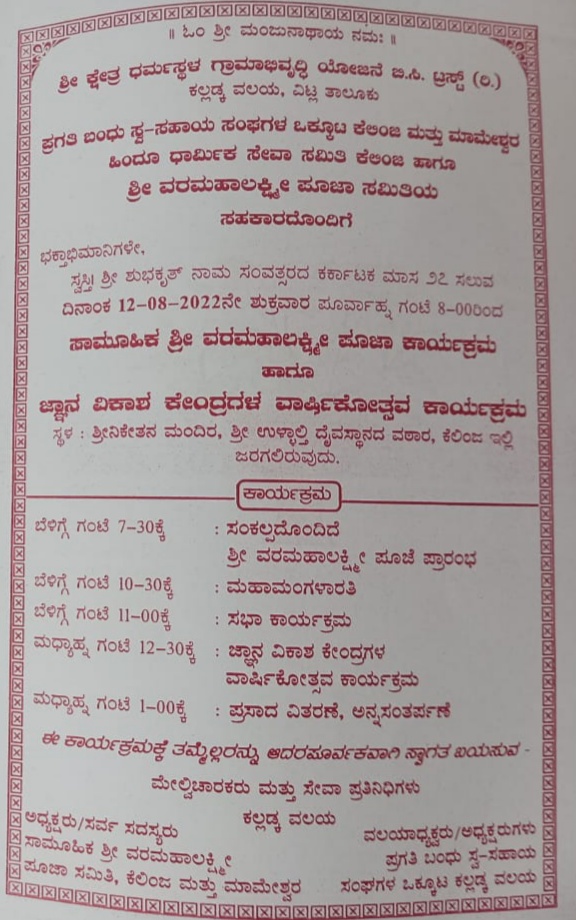 ವಿಟ್ಲ: ಆ.12ರಂದು ಕೆಲಿಂಜ ಶ್ರೀ ಉಳ್ಳಾಲ್ತಿ ದೇವಸ್ಥಾನದ ಶ್ರೀನಿಕೇತನ ಸಭಾಭವನದಲ್ಲಿ ಸಾಮೂಹಿಕ ಶ್ರೀ ವರಮಹಾಲಕ್ಷ್ಮಿ ಪೂಜೆ ಹಾಗೂ ಜ್ಞಾನವಿಕಾಸ ಕೇಂದ್ರಗಳ ವಾರ್ಷಿಕೋತ್ಸವ ಕಾರ್ಯಕ್ರಮ – ಕಹಳೆ ನ್ಯೂಸ್