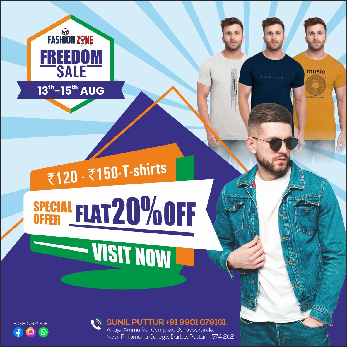 20% ಫ್ಲಾಟ್ ಡಿಸ್ಕೌಂಟ್ನಲ್ಲಿ ಮೆನ್ಸ್ ಕಲೆಕ್ಷನ್, ಕೇವಲ ರೂ120ರಿಂದ ರೂ150ರಲ್ಲಿ ಸೂಪರ್ ಕಲರ್, ಡಿಸೈನ್ನೊಂದಿಗೆ ಗ್ರಾಹಕರು ಟಿ-ಶರ್ಟ್ ಖರೀದಿಸಬಹುದು. ಪುತ್ತೂರಿನಲ್ಲಿ ಹುಡುಗರ, ಪುರುಷರ ಅತೀ ನೆಚ್ಚಿನ ಮಳಿಗೆ ಇದಾಗಿದ್ದು, ಟ್ರೆಂಡ್ ಟಿ- ಶರ್ಟ್ಸ್, ಟಿ-ಶರ್ಟ್ಸ್, ಜೀನ್ಸ್ ಪ್ಯಾಂಟ್, ಫಾರ್ಮಲ್ ಡ್ರೆಸ್ ಸೇರಿದಂತೆ ನಿಮ್ಮಿಷ್ಟದ ಬಟ್ಟೆಗಳನ್ನು 20% ಫ್ಲಾಟ್ ಡಿಸ್ಕೌಂಟ್ನಲ್ಲಿ ಖರೀದಿಸಿ.