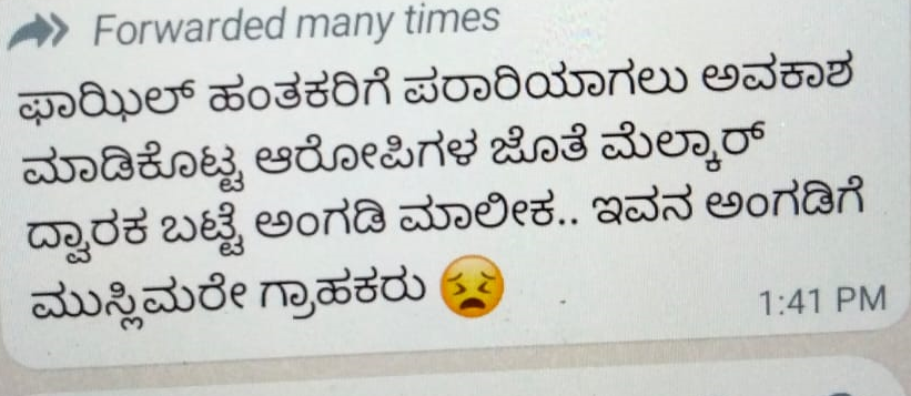 ಬಂಟ್ವಾಳ ತಾಲೂಕು ಪಾಣೆಮಂಗಳೂರು ಗ್ರಾಮದ ಮೆಲ್ಕಾರ್ ಎಂಬಲ್ಲಿ ಕೌಶಿಲ್ ಎಂಬವರು ಧ್ವಾರಕ ಮೆನ್ಸ್ ಡ್ರೆಸ್ ಶಾಪ್ ಇಟ್ಟುಕೊಂಡಿದ್ದು ಇವರ ಬಗ್ಗೆ ಕೆಲ ವ್ಯಕ್ತಿಗಳು ಸುಳ್ಳು ಸುದ್ದಿ ಹಬ್ಬಿಸುತ್ತಿದ್ದಾರೆ. ‘ಫಾಝಿಲ್ ಕೊಲೆ ಹಂತಕರಿಗೆ ಪರಾರಿಯಾಗಲು ಅವಕಾಶ ಮಾಡಿಕೊಟ್ಟ ಆರೋಪಿಗಳ ಜೊತೆ ಮೆಲ್ಕಾರ್ ದ್ವಾರಕ ಬಟ್ಟೆ ಮಾಲೀಕ ಶಾಮೀಲಾಗಿರುವುದಾಗಿ’ ಸುಳ್ಳು ಆರೋಪ ಹೊರಿಸಿ ವಾಟ್ಸ್ಆಪ್ನಲ್ಲಿ ಭಾವಚಿತ್ರ ಹಾಕಿ ಸುದ್ದಿ ಹರಿ ಬಿಡುತ್ತಿದ್ದಾರೆ.