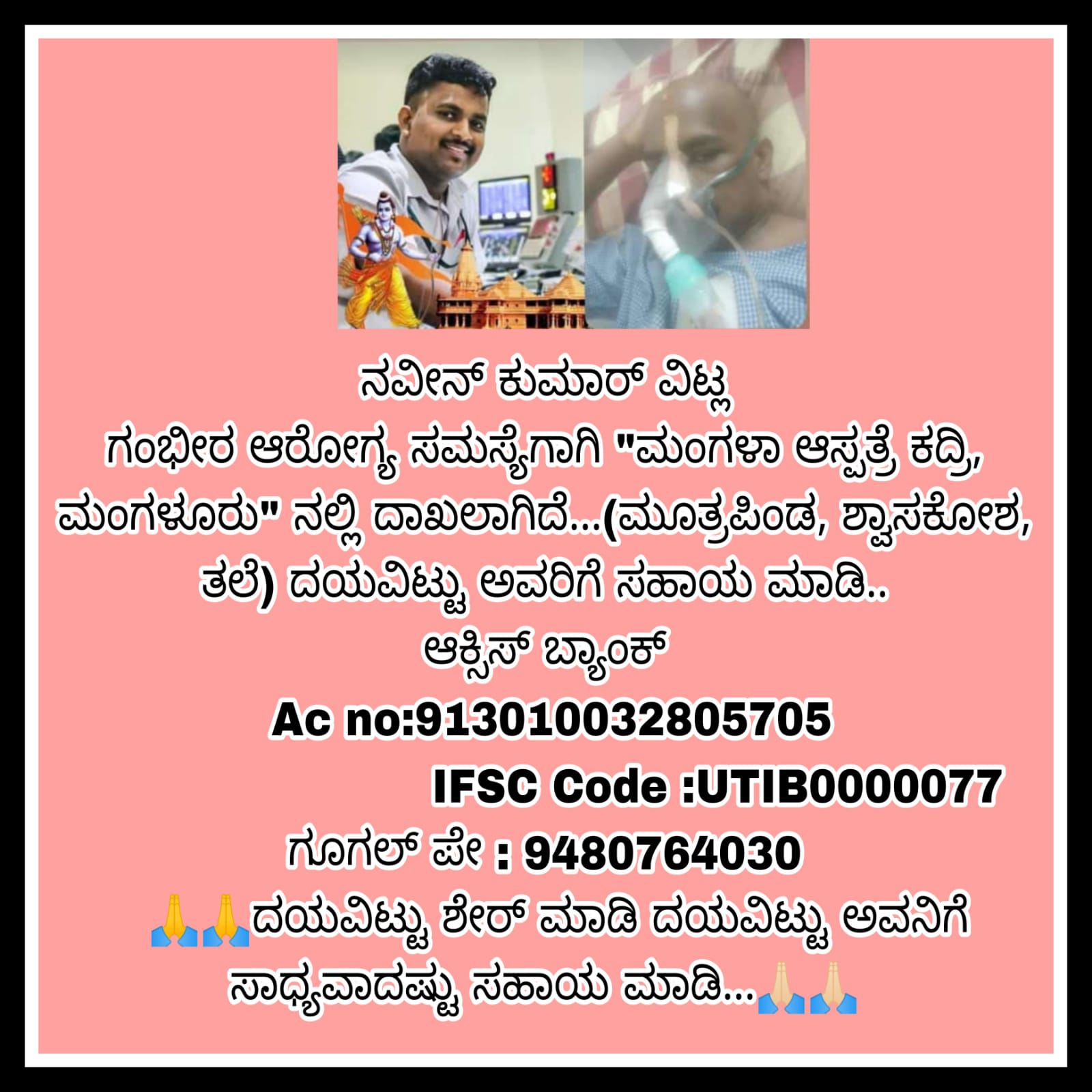 ಬಂಟ್ವಾಳ : ಬಂಟ್ವಾಳ ತಾಲೂಕಿನ ಅಳಿಕೆ ಗ್ರಾಮದ ಉಕ್ಕುಡ ದರ್ಬೆಯ ನವೀನ್ ಕುಮಾರ್ ಎಂಬವರು ಕಿಡ್ನಿ, ಶ್ವಾಸಕೋಶ, ಮೂತ್ರಪಿಂಡದ ಸಮಸ್ಯೆಯಿಂದ ಬಳಲುತ್ತಿದ್ದು ಮಂಗಳೂರಿನ ಖಾಸಗಿ ಆಸ್ಪತ್ರೆಯಲ್ಲಿ ದಾಖಲಾಗಿದ್ದಾರೆ. ದಿನಕ್ಕೆ 10ರಿಂದ 15 ಸಾವಿರದವರೆಗೆ ಚಿಕಿತ್ಸೆಗಾಗಿ ಖರ್ಚು ತಗಲುತ್ತಿದ್ದು, ಇದೀಗ ಇವರ ಕುಟುಂಬಸ್ಥರು ಹಾಗೂ ಸ್ನೇಹಿತರು ದಾನಿಗಳ ನೆರವಿನ ನಿರೀಕ್ಷೆಯಲ್ಲಿದ್ದಾರೆ. ತೀರಾ ಬಡ ಕುಟುಂಬದಲ್ಲಿದ್ದ ನವೀನ್ ರವರು ಇವರು, ಇಡೀ ಕುಟಂಬಕ್ಕೆ ಆಧಾರವಾಗಿದ್ರು, ಎರಡು ವರ್ಷದ ಹಿಂದೆ ಉದ್ಯೋಗದಲ್ಲಿರುವ ಸಮಯ ರಕ್ತ ಪರೀಕ್ಷೆ ಮಾಡುವ ವೇಳೆ ಕಿಡ್ನಿ ವೈಫಲ್ಯದ ಸಮಸ್ಯೆ ಇದೆಯೆಂದು ವೈದ್ಯರು ಸೂಚಿಸಿದ್ದರು. ವೈದ್ಯರ ಸೂಚನೆಯಂತೆ ಎರಡು ವರ್ಷದಿಂದ ವಾರದಲ್ಲಿ ಎರಡು ಬಾರಿ ಡಯಾಲಿಸಿಸ್ ಮಾಡಿಕೊಂಡು ಬರುತ್ತಿದ್ದರು. ಒಂದು ವಾರದ ಹಿಂದೆ ತೀವ್ರ ಅನಾರೋಗ್ಯಕ್ಕೆ ತುತ್ತಾಗಿದ ಇವರನ್ನು ಮಂಗಳೂರಿನ ಮಂಗಳ ಹಾಸ್ಪಿಟಲ್ ಮತ್ತು ಕಿಡ್ನಿ ಪೌಂಡೇಶನ್ನಲ್ಲಿ ದಾಖಲು ಮಾಡಲಾಗಿದೆ. ವೈದ್ಯರು ಪರೀಕ್ಷಿಸಿದ ನಂತರ ಕಿಡ್ನಿ, ಮೂತ್ರಪಿಂಡ, ಶ್ವಾಸಕೋಶ, ತಲೆ ಸಂಬಂಧಿಸಿದಂತೆ ಸಮಸ್ಯೆ ಇದೆಯೆಂದು ತಿಳಿಸಿದ್ದಾರೆ. ಹೀಗಾಗಿ ದಿನಕ್ಕೆ 10 ರಿಂದ 15 ಸಾವಿರ ರೂಪಾಯಿ ಹಣ ಚಿಕಿತ್ಸೆಗೆ ಬೇಕಾಗಿದ್ದು, ತೀರಾ ಬಡತನದಲ್ಲಿರುವ ಕುಟುಂಬಕ್ಕೆ ಇಷ್ಟೊಂದು ಹಣ ಹೊಂದಿಸಲು ಸಾಧ್ಯವಾಗುತ್ತಿಲ್ಲ. ಹೀಗಾಗಿ ಇವರ ಕುಟುಂಬಕ್ಕೆ ಸಹಾಯವಾಗಲೆಂದು ಯುವಜನ ಸೇವಾ ಟ್ರಸ್ಟ್(ರಿ) ಇದರ ಅಧ್ಯಕ್ಷರು ಮತ್ತು ಸರ್ವಸದಸ್ಯರುಗಳು ಸಂಘ-ಸಂಸ್ಥೆಗಳ, ಸಹೃದಯಿ ದಾನಿಗಳ ಸಹಾಯ ಯಾಚಿಸಿದ್ದಾರೆ.