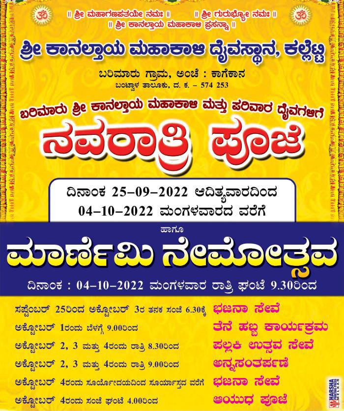 ಸೆ.25ರಿಂದ ಅ.04ರವರೆಗೆ ಬರಿಮಾರು ಕಲ್ಲೆಟ್ಟಿ ಶ್ರೀ ಕಾನಲ್ತಾಯ ಮಹಾಕಾಳಿ ದೈವಸ್ಥಾನದಲ್ಲಿ ನವರಾತ್ರಿ ಪೂಜೆ ಹಾಗೂ ಮಾರ್ಣಿಮಿ ನೇಮೋತ್ಸವ – ಕಹಳೆ ನ್ಯೂಸ್