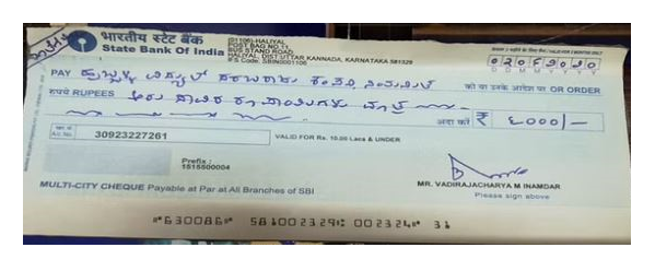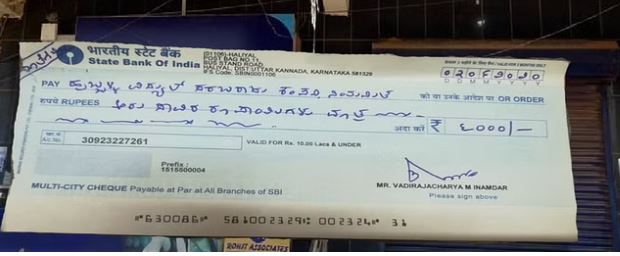 ಉತ್ತರ ಕನ್ನಡ ಜಿಲ್ಲೆಯ ಹಳಿಯಾಳ ತಾಲ್ಲೂಕಿನ ಭಾರತೀಯ ಸ್ಟೇಟ್ ಬ್ಯಾಂಕ್ಗೆ ಹೋಗಿದ್ದ ವಾದಿರಾಚಾರ್ಯ ಇನಾಮಾದಾರ ಅವರ 6 ಸಾವಿರ ಮೌಲ್ಯದ ಚೆಕ್ ಅನ್ನು ಕನ್ನಡ ಭಾಷೆ ಅಂಕಿ-ಸ0ಖ್ಯೆಯಲ್ಲಿ ಚೆಕ್ ಬರೆದು ವಿದ್ಯುತ್ ಶುಲ್ಕ ಪಾವತಿಯ ಭಾಗವಾಗಿ ಹುಬ್ಬಳ್ಳಿ ವಿದ್ಯುತ್ ಸರಬರಾಜು ಕಂಪೆನಿಗೆ ನೀಡಿದ್ದಾರೆ.