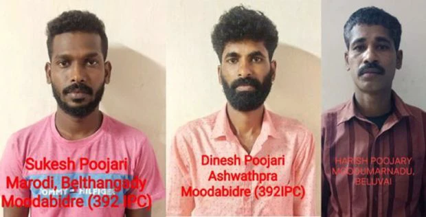 ಮೂಡಬಿದ್ರಿಯ ಬಡಗ ಮಿಜಾರ್ ಗ್ರಾಮದ ನಿವಾಸಿ ದಿನೇಶ್ ಪೂಜಾರಿ (36), ಬೆಳ್ತಂಗಡಿ ತಾಲೂಕಿನ ಉಳ್ಳಗುಡ್ಡೆ ಹೊಸಮನೆ ನಿವಾಸಿ ಸುಕೇಶ್ ಪೂಜಾರಿ (32), ಮೂಡಬಿದ್ರಿಯ ನಿರ್ಪಣ ದಡ್ಕೆ ನಿವಾಸಿ ಹರೀಶ್ ಪೂಜಾರಿ (34) ಬಂಧಿತ ಆರೋಪಿಗಳು.