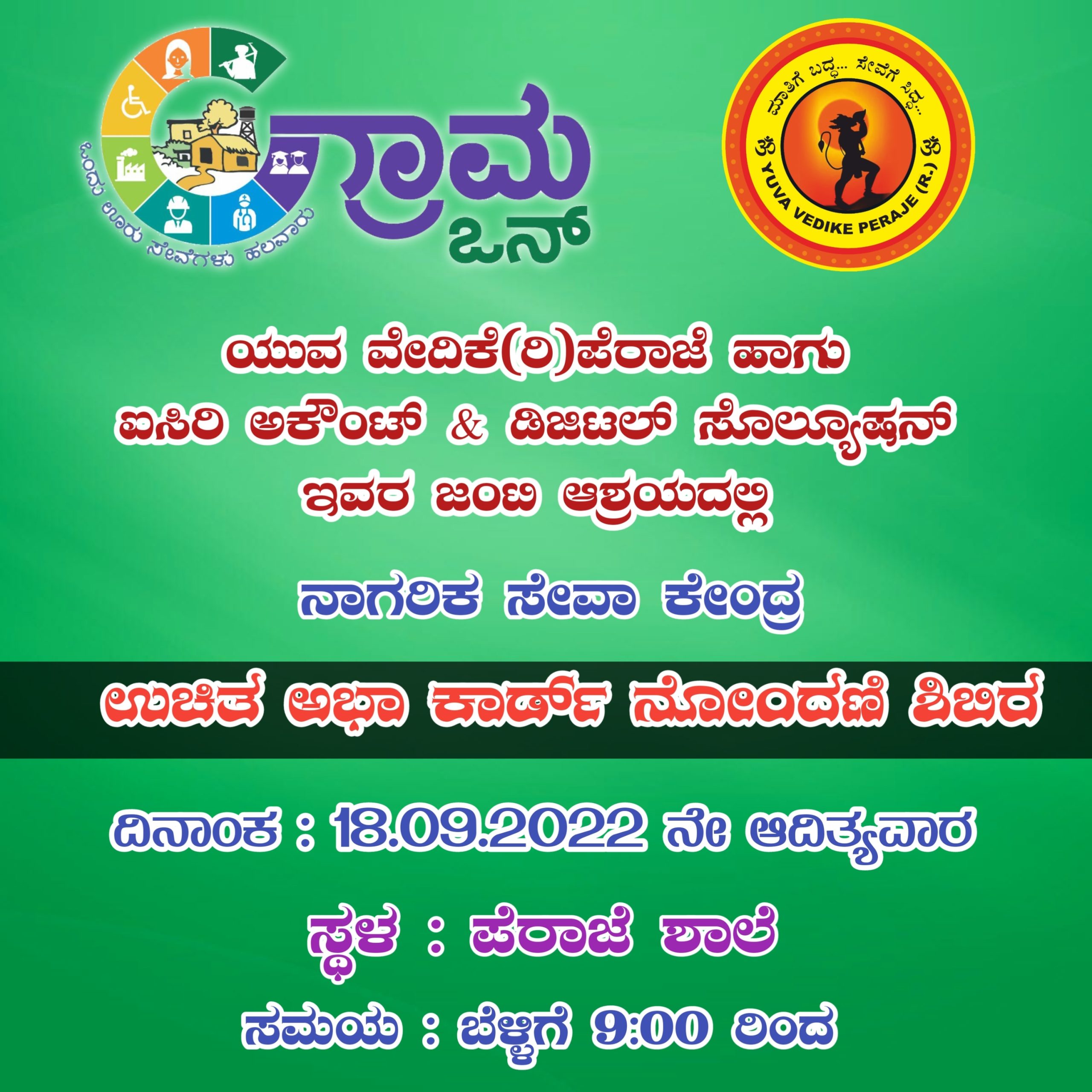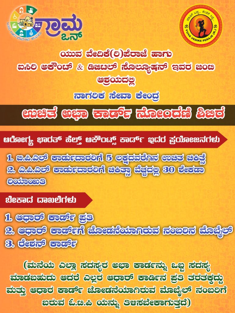 ಸೆ. 18ರಂದು ಯುವ ವೇದಿಕೆ (ರಿ) ಪೆರಾಜೆ ಹಾಗೂ ಐಸಿರಿ ಅಕೌಂಟ್ & ಡಿಜಿಟಲ್ ಸೊಲ್ಯೂಷನ್ ಇವರ ಜಂಟಿ ಆಶ್ರಯದಲ್ಲಿ ನಾಗರಿಕ ಸೇವಾ ಕೇಂದ್ರ ಉಚಿತ ಅಭಾ ಕಾರ್ಡ್ ನೋಂದಣಿ ಶಿಬಿರ – ಕಹಳೆ ನ್ಯೂಸ್