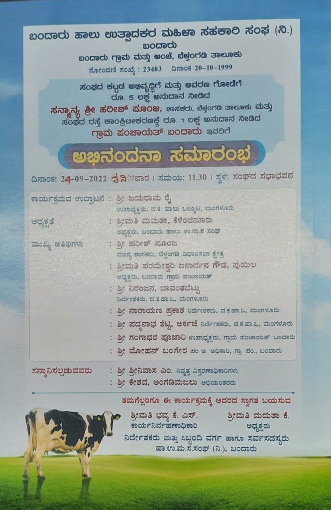 ಬಂದಾರು ಹಾಲು ಉತ್ಪಾದಕರ ಮಹಿಳಾ ಸಹಕಾರಿ ಸಂಘ (ನಿ.) ಬಂದಾರು ವತಿಯಿಂದ ಸೆ.24 ಶನಿವಾರ ದಂದು ವಾರ್ಷಿಕ ಸಾಮಾನ್ಯ ಸಭೆ ಹಾಗೂ ಶಾಸಕ ಹರೀಶ್ ಪೂಂಜಾ ಹಾಗೂ ಗ್ರಾಮ ಪಂಚಾಯತ್ ಬಂದಾರು ಇವರಿಗೆ ಅಭಿನಂದನಾ ಸಮಾರಂಭ – ಕಹಳೆ ನ್ಯೂಸ್
