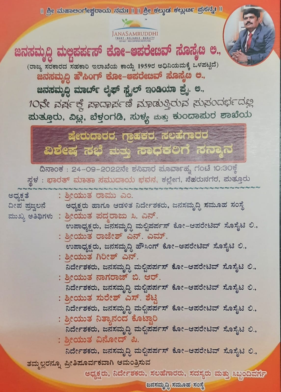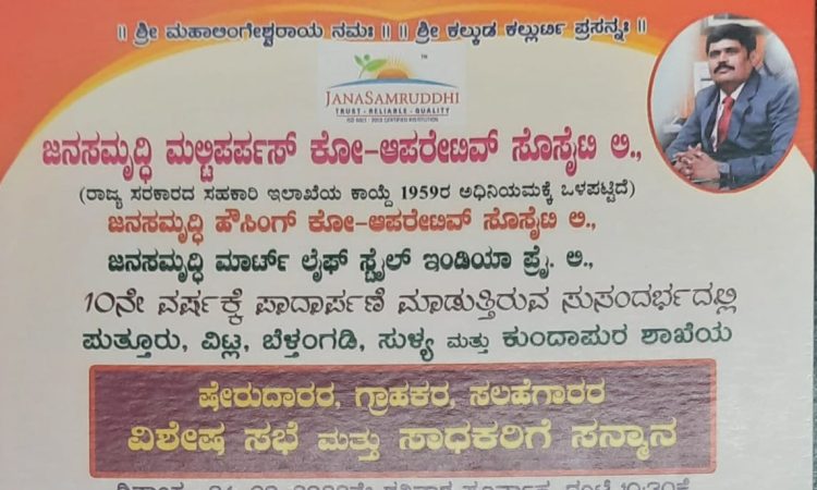 ಸೆ.24ರಂದು 10ನೇ ವರ್ಷಕ್ಕೆ ಪಾದಾರ್ಪಣೆ ಮಾಡುತ್ತಿರುವ ಜನಸಮೃದ್ಧಿ ಸಮೂಹ ಸಂಸ್ಥೆಯ ಷೇರುದಾರರ, ಗ್ರಾಹಕರ, ಸಲಹೆಗಾರರ ವಿಶೇಷ ಸಭೆ ಮತ್ತು ಸಾಧಕರಿಗೆ ಸನ್ಮಾನ ಕಾರ್ಯಕ್ರಮ – ಕಹಳೆ ನ್ಯೂಸ್