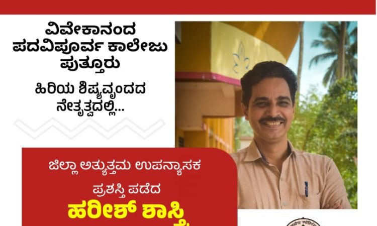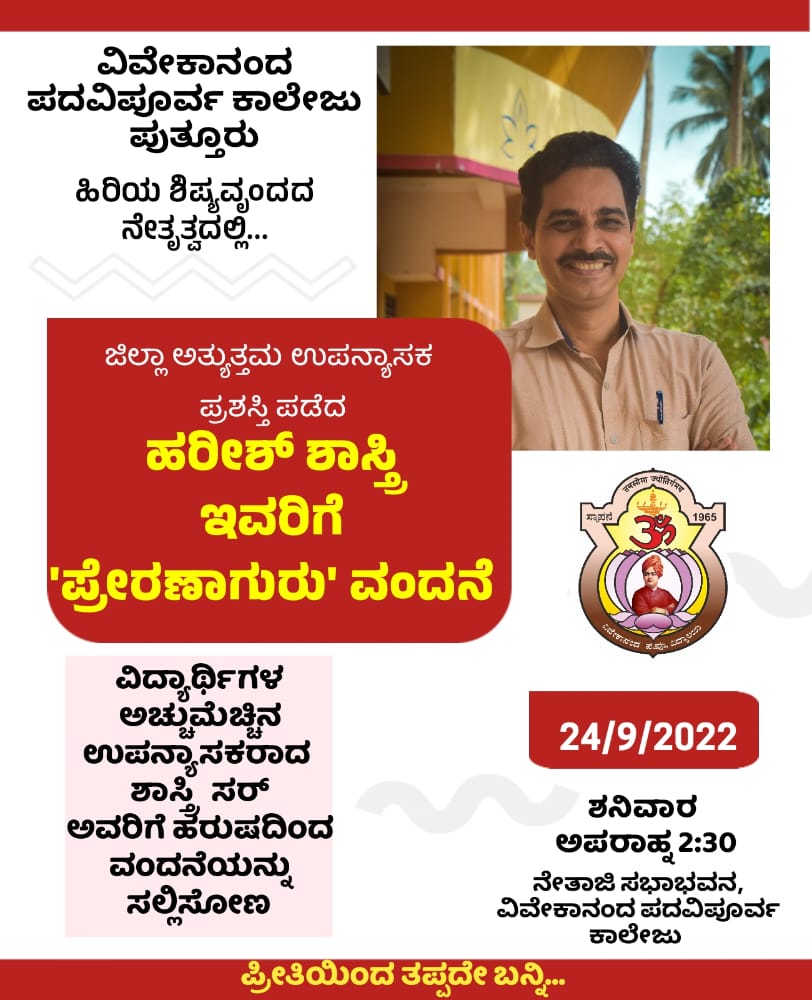 ಪುತ್ತೂರು: ಇಲ್ಲಿನ ನೆಹರೂನಗರದ ವಿವೇಕಾನಂದ ಪದವಿ ಪೂರ್ವ ಕಾಲೇಜಿನ ಹಿರಿಯ ವಿದ್ಯಾರ್ಥಿ ವೃಂದದ ನೇತೃತ್ವದಲ್ಲಿ ದಕ್ಷಿಣ ಕನ್ನಡ ಜಿಲ್ಲಾ ಅತ್ಯುತ್ತಮ ಶಿಕ್ಷಕ ಪ್ರಶಸ್ತಿಗೆ ಭಾಜನರಾದ ಕಾಲೇಜಿನ ಭೌತಶಾಸ್ತ್ರ ವಿಭಾಗದ ಮುಖ್ಯಸ್ಥ ಹರೀಶ್ ಶಾಸ್ತ್ರಿ ಅವರಿಗೆ ‘ಪ್ರೇರಣಾಗುರು’ ವಂದನೆ ಕಾರ್ಯಕ್ರಮ ಜರುಗಲಿದೆ.