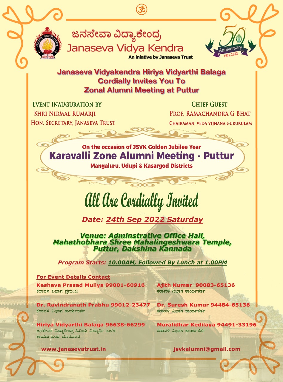 ಪುತ್ತೂರು: ಜನಸೇವಾ ವಿದ್ಯಾಕೇಂದ್ರದ ಸುವರ್ಣ ಮಹೋತ್ಸವ ವರ್ಷಾಚರಣೆ ಪ್ರಯುಕ್ತ ಸಂಸ್ಥೆಯ ಹಿರಿಯ ವಿದ್ಯಾರ್ಥಿಗಳ ಬಳಗದಿಂದ ವಲಯ ಮಟ್ಟದ ಸಭೆ ಪುತ್ತೂರಿನಲ್ಲಿ ನಾಳೆ (ಸೆ.24) ನಡೆಯಲಿದೆ.
