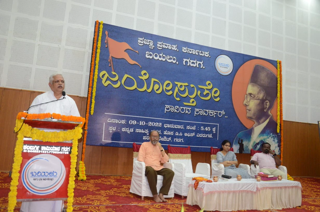 ನಗರದ ಕನ್ನಡ ಸಾಹಿತ್ಯ ಭವನದಲ್ಲಿಪ್ರಜ್ಞಾ ಪ್ರವಾಹ ಕರ್ನಾಟಕ, ಬಯಲು ಸಂಘಟನೆ ವತಿಯಿಂದ ಆಯೋಜಿಸಿದ್ದ ಜಯೋಸ್ತುತೇ ಸಾವಿರದ ಸಾವರ್ಕರ್ ಕಾರ್ಯಕ್ರಮದಲ್ಲಿ ಅವರು ಮಾತನಾಡಿದರು.