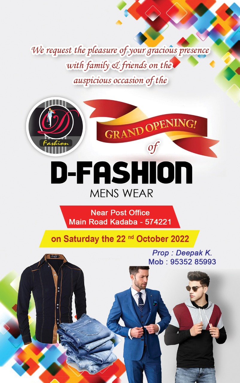 ಕಡಬ: ಅ. 22ರಂದು ಕಡಬ ಪೋಸ್ಟ್ ಆಫೀಸ್ ಹತ್ತಿರ ದೀಪಕ್ ಅವರ ಮಾಲಕತ್ವದ “ಡಿ- ಫ್ಯಾಷನ್ ಮೆನ್ಸ್ ವೇರ್” ಪುರುಷರ ಬಟ್ಟೆ ಮಳಿಗೆ ಅದ್ಧೂರಿಯಾಗಿ ಶುಭಾರಂಭಗೊಳ್ಳಲಿದೆ.