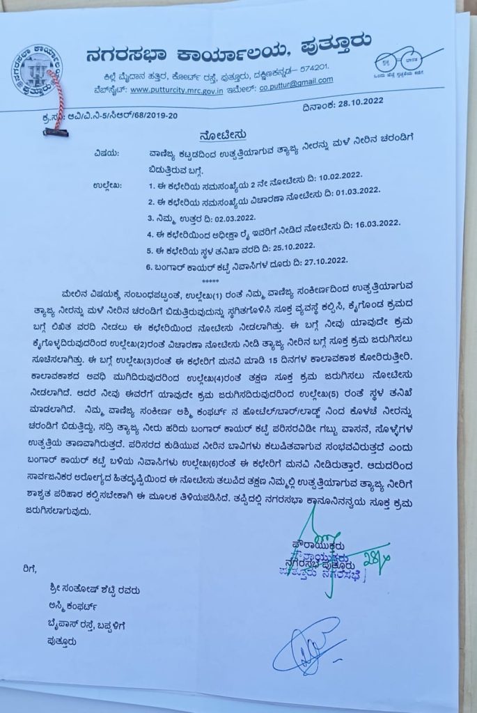 ದೂರಿನ ಮೇರೆಗೆ ನಗರಸಭೆಯಿಂದ ಹೋಟೆಲ್ ಮಾಲಿಕರಿಗೆ ನೋಟಿಸ್ ನೀಡಿ, 15ದಿನಗಳ ಒಳಗಾಗಿ ಮಳೆನೀರಿನ ಚರಂಡಿಗೆ ಬಿಡುತ್ತಿದ್ದ ತ್ಯಾಜ್ಯ ನೀರಿಗೆ ಸೂಕ್ತ ಪರ್ಯಾಯ ವ್ಯವಸ್ಥೆ ಕಲ್ಪಿಸಿಕೊಡುವಂತೆ ತಿಳಿಸಿತ್ತು. ಆದರೆ ಈ ಬಗ್ಗೆ ಯಾವುದೇ ರೀತಿಯಲ್ಲೂ ಅಶ್ಮಿ ಕಂಫರ್ಟ್ ವಾಣಿಜ್ಯ ಸಂಕೀರ್ಣ ದವರು ಕ್ರಮ ಕೈಗೊಳ್ಳದೆ, ಇಲ್ಲಿನ ಸ್ಥಳೀಯ ಪರಿಸರವಿಡೀ ಗಬ್ಬು ವಾಸನೆ ಜೊತೆಗೆ ಸೊಳ್ಳೆಗಳ ಉತ್ಪತ್ತಿ ತಾಣವಾಗಿತ್ತು. ಇದನ್ನ ಅರಿತ ನಗರಸಭೆ ಅಧ್ಯಕ್ಷ ಜೀವಂಧರ್ ಜೈನ್, ನಗರಸಭೆ ಸದಸ್ಯ ಅಶೋಕ್ ಶೆಣೈ ತಕ್ಷಣ ಸ್ಪಂದಿಸಿ ಹೆಲ್ತ್ ಇನ್ಸ್ಪೆಕ್ಟರ್ ವರಲಕ್ಷ್ಮಿ ಮತ್ತು ನಗರಸಭೆಯ ಪುರುಷೋತ್ತಮ್ ಸೇರಿದಂತೆ ಪುತ್ತೂರು ಪೊಲೀಸ್ ಠಾಣಾ ಎ.ಎಸ್.ಐ ಲೋಕನಾಥ್ ಮತ್ತು ಉದಯ ಇವರು ಸ್ಥಳಕ್ಕೆ ಭೇಟಿ ನೀಡಿ ಪರಿಶೀಲನೆ ನಡೆಸಿದ್ದಾರೆ. ಅಲ್ಲದೆ ಮಳೆನೀರಿನ ಚರಂಡಿಗೆ ಬಿಡುತ್ತಿದ್ದ ತ್ಯಾಜ್ಯ ನೀರಿಗೆ ಪರ್ಯಾಯ ವ್ಯವಸ್ಥೆ ಮಾಡುವಂತೆ ಸೂಚನೆ ನೀಡಿದ್ದಾರೆ. ಕಾನೂನು ಪ್ರಕಾರ STP ( sewerage treatment plant) ಮಾಡಲು ಸ್ಥಳೀಯ ನಿವಾಸಿಗಳು ಆಗ್ರಹಿಸಿದ್ದಾರೆ.