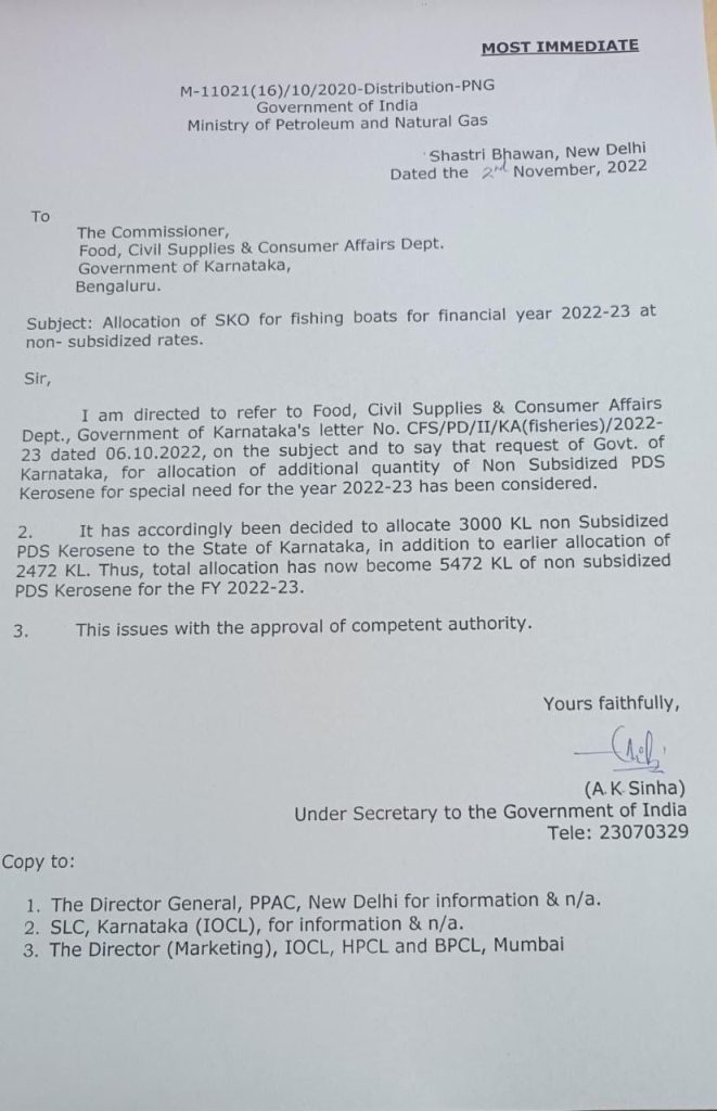 ಕೇಂದ್ರ ಕೃಷಿ ರಾಜ್ಯ ಸಚಿವರ ಮನವಿಯನ್ನು ಪುರಸ್ಕರಿಸಿದ ಕೇಂದ್ರ ಪೆಟ್ರೋಲಿಯಂ ಸಚಿವಾಲಯ ಇಂದು (ದಿನಾಂಕ 02.11.22) ಕರ್ನಾಟಕ ಸರ್ಕಾರಕ್ಕೆ 2022-23ನೇ ಪಾಲಿನ 3000KL (30.00 ಲಕ್ಷ ಲೀಟರ್) ಹೆಚ್ಚುವರಿ ಸೀಮೆ ಎಣ್ಣೆಯನ್ನು ಬಿಡುಗಡೆ ಮಾಡಿ ಆದೇಶ ಹೊರಡಿಸಿದೆ.