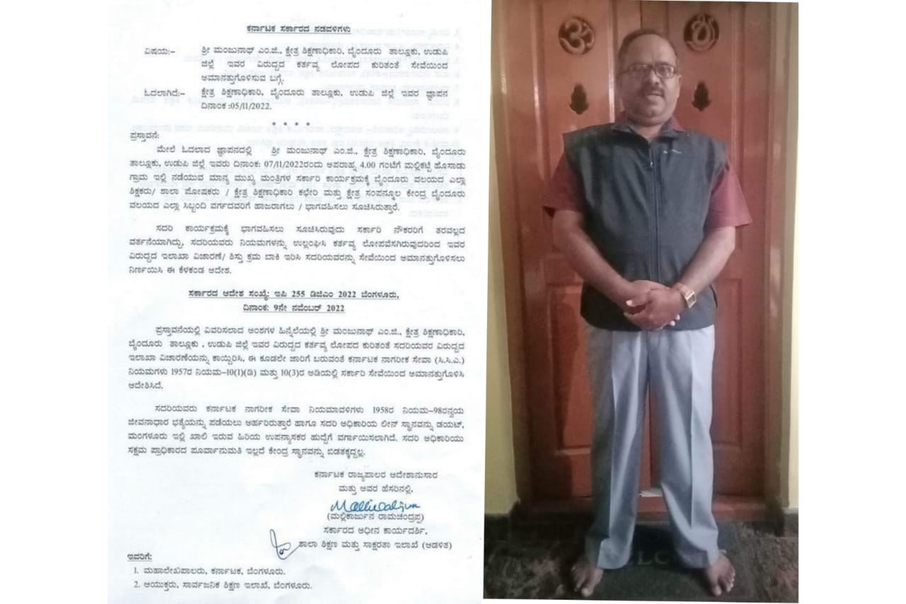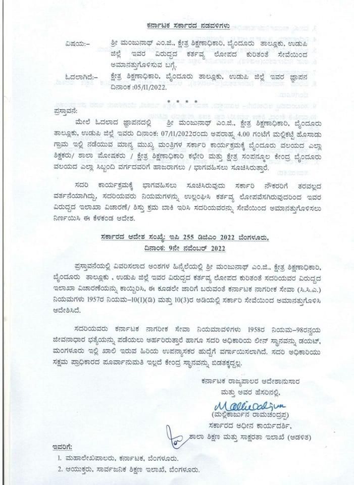 ಈ ಹಿನ್ನೆಲೆಯಲ್ಲಿ ಇದೀಗ ಬೈಂದೂರು ಬಿಇಓ ಮಂಜುನಾಥ್ ಗೆ ಅಮಾನತು ಶಿಕ್ಷೆ ಆದೇಶವಾಗಿದೆ ಎಂದು ತಿಳಿದು ಬಂದಿದೆ.
