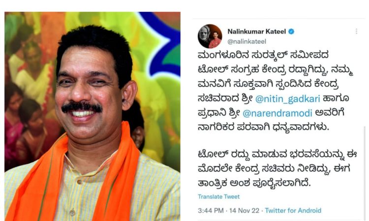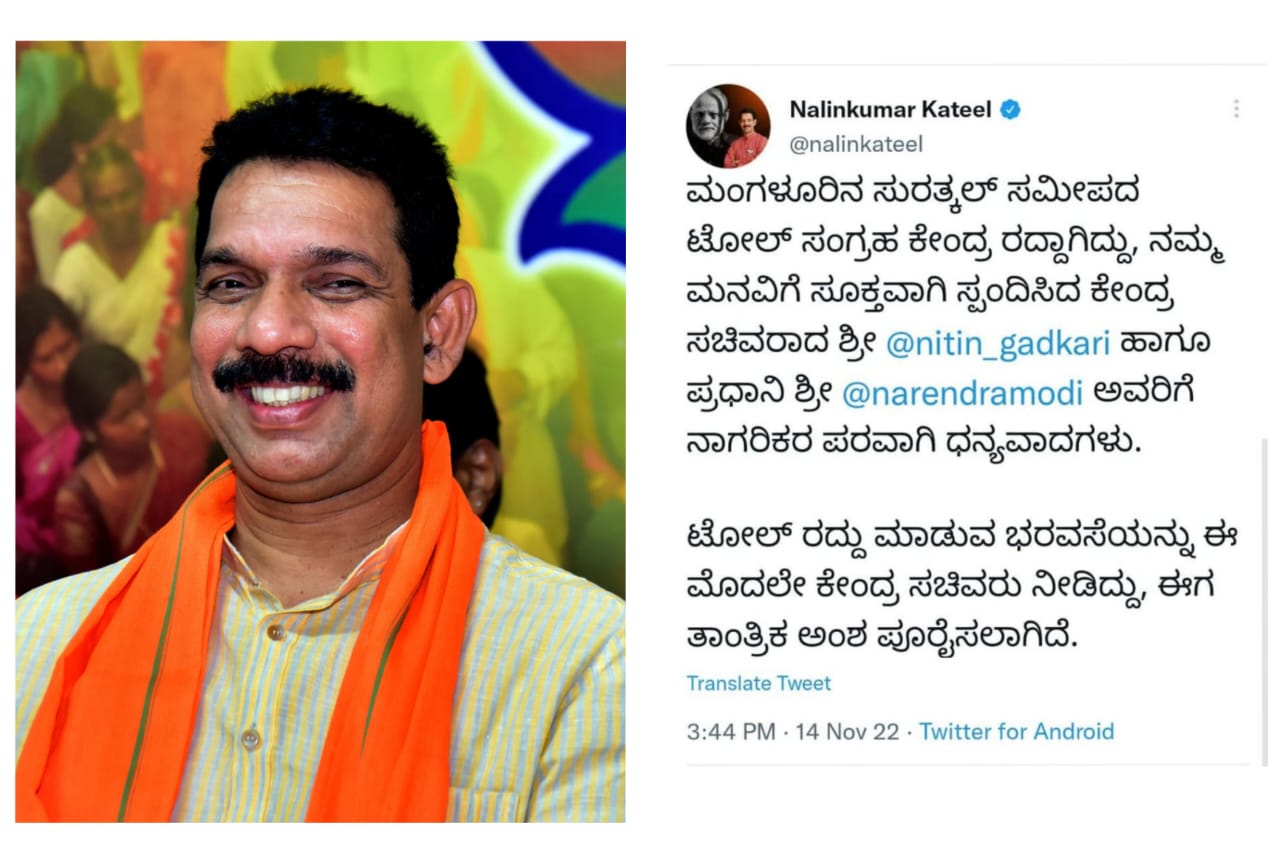 ಈ ಬಗ್ಗೆ ಸಂಸದ ನಳಿನ್ ಕುಮಾರ್ ಕಟೀಲ್ ರವರು ಟ್ವೀಟ್ ಮಾಡಿದ್ದು, “ಮಂಗಳೂರಿನ ಸುರತ್ಕಲ್ ಸಮೀಪದ ಟೋಲ್ ಸಂಗ್ರಹ ಕೇಂದ್ರ ರದ್ದಾಗಿದ್ದು, ನಮ್ಮ ಮನವಿಗೆ ಸ್ಪಂದಿಸಿದ ಕೇಂದ್ರ ಸಚಿವರಿಗೆ ಮತ್ತು ಪ್ರಧಾನಿಗಳಿಗೆ ಧನ್ಯವಾದಗಳು” ಎಂದು ಹೇಳಿದ್ದಾರೆ. ಸುರತ್ಕಲ್ ಟೋಲ್ ಗೇಟ್ ಅನ್ನು ರದ್ದುಗೊಳಿಸುವಂತೆ ಹಲವು ಜನ ಪ್ರತಿಭಟನೆ ಕೂಡ ನಡೆಸಿದ್ದರು.