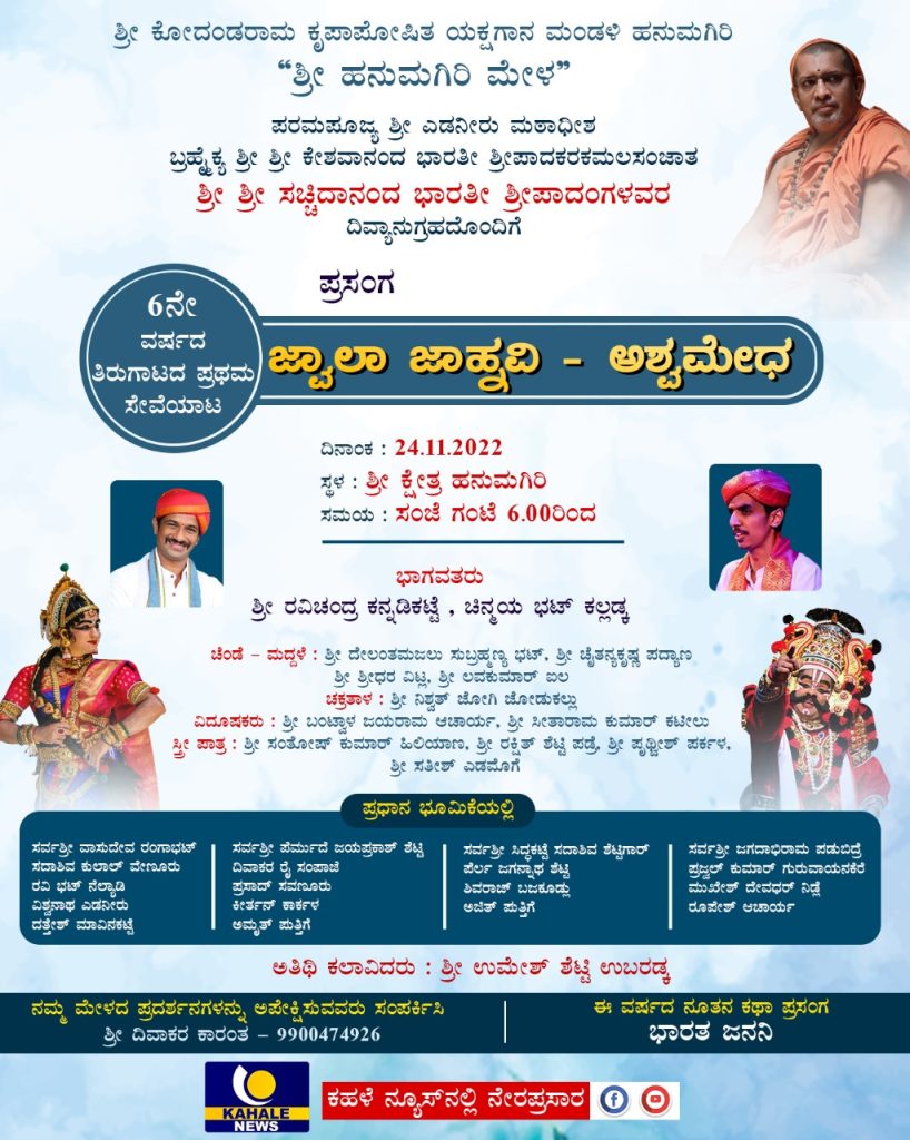 ನಾಳೆ ( ನ.24 ) ತೆಂಕುತ್ತಿಟ್ಟಿನ ಗಜ ಮೇಳದ ದಿಗ್ವಿಜಯ ; ಹನುಮಗಿರಿಯಲ್ಲಿ ಪ್ರಥಮ ಸೇವೆ – ಜ್ವಾಲಾ ಜಾಹ್ನವಿ, ಅಶ್ವಮೇಧ : ಯಕ್ಷಾಭಿಮಾನಿಗಳಲ್ಲಿ ನಿರೀಕ್ಷೆ ಹುಟ್ಟಿಸಿದೆ ಈ ವರ್ಷದ ನೂತನ ಕಥಾ ಪ್ರಸಂಗ ” ಭಾರತ ಜನನಿ ” – ಕಹಳೆ ನ್ಯೂಸ್