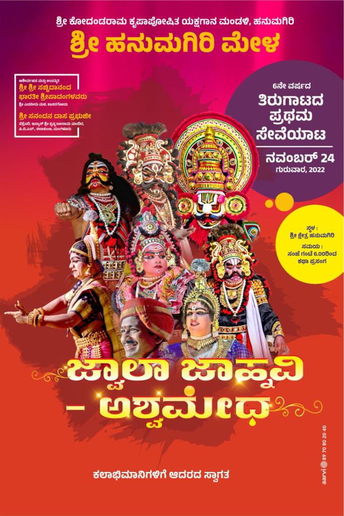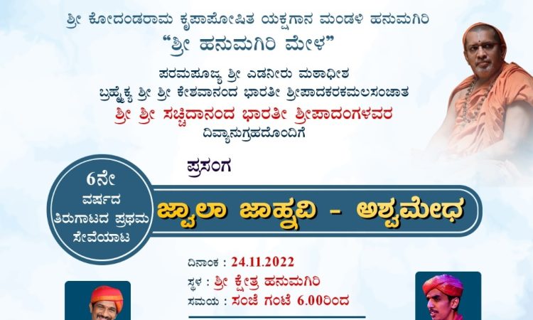 ಎಡನೀರು ಮಠದ ಶ್ರೀ ಶ್ರೀಸಚ್ಚಿದಾನಂದ ಭಾರತೀ ಶ್ರೀಪಾದಂಗಳವರ ಆಶೀರ್ವಚನ ಮತ್ತು ಉಪಸ್ಥಿತಿಯಲ್ಲಿ ಮಂಗಳೂರಿನ ಇಸ್ಕಾನ್ ಶ್ರೀಕೃಷ್ಣ ಬಲರಾಮ ಮಂದಿರದ ಶ್ರೀ ಸನಂದನ ದಾಸ ಪ್ರಭು ಜೀಯವರ ಉಪಸ್ಥಿತಿಯಲ್ಲಿ ಸಭಾ ಕಾರ್ಯಕ್ರಮ ನಡೆಯಲಿದೆ. ನಂತರ ಪ್ರಥಮ ಸೇವೆಯಾಟವಾಗಿ ಜ್ವಾಲಾ ಜಾಹ್ನವಿ, ಅಶ್ವಮೇಧ ಎಂಬ ಕಥಾಭಾಗವನ್ನು ಕಲಾವಿದರು ಆಡಿತೋರಿಸಲಿದ್ದಾರೆ.