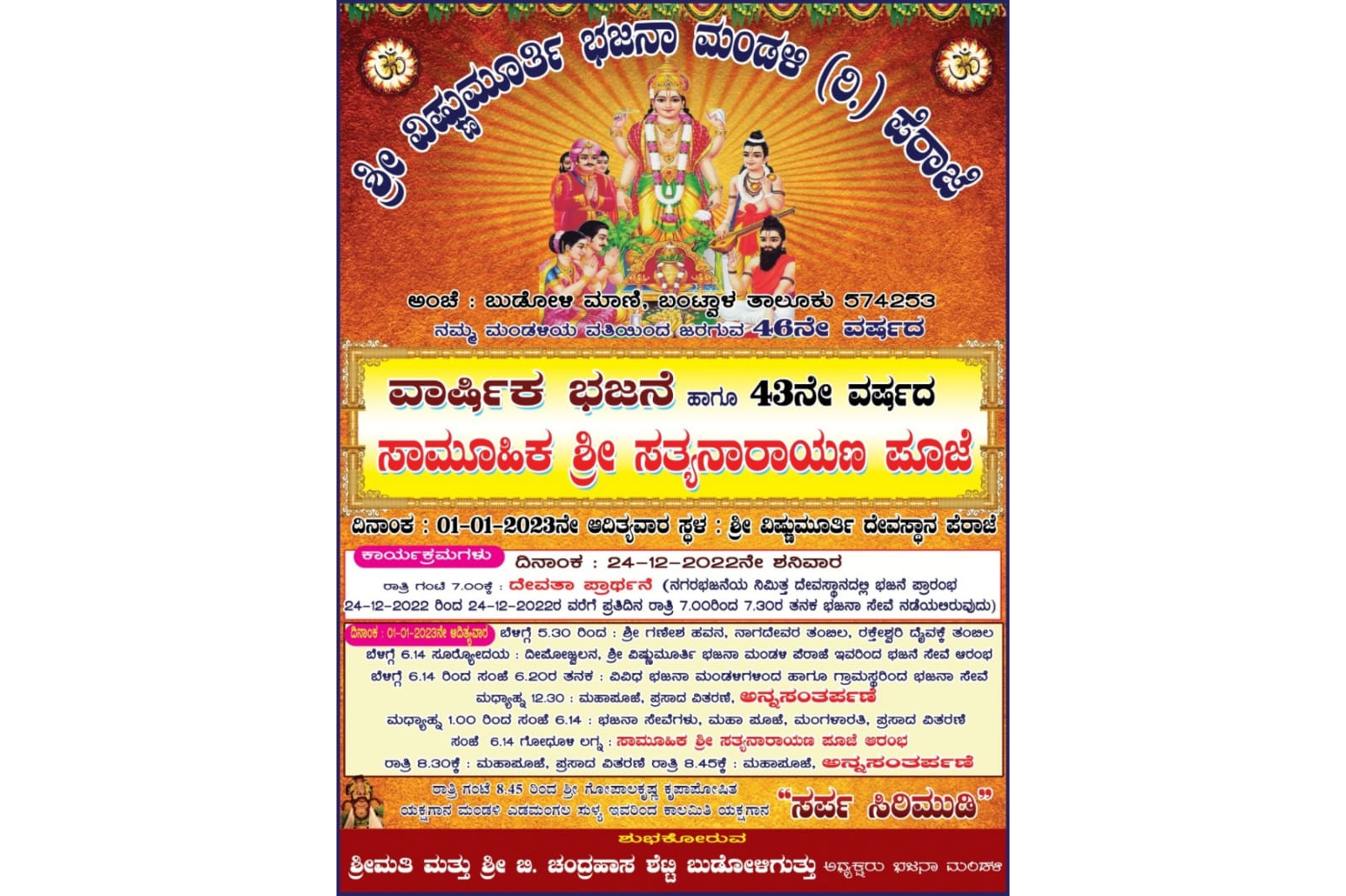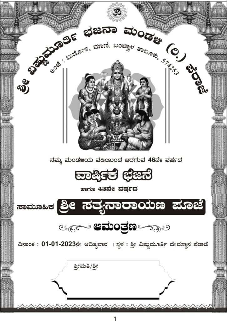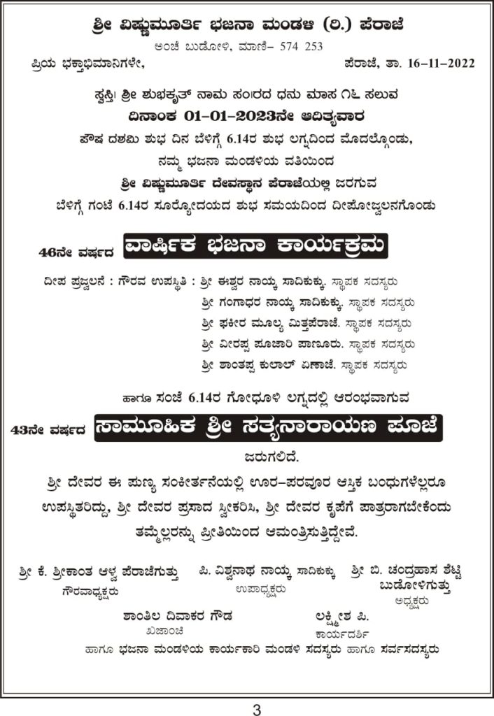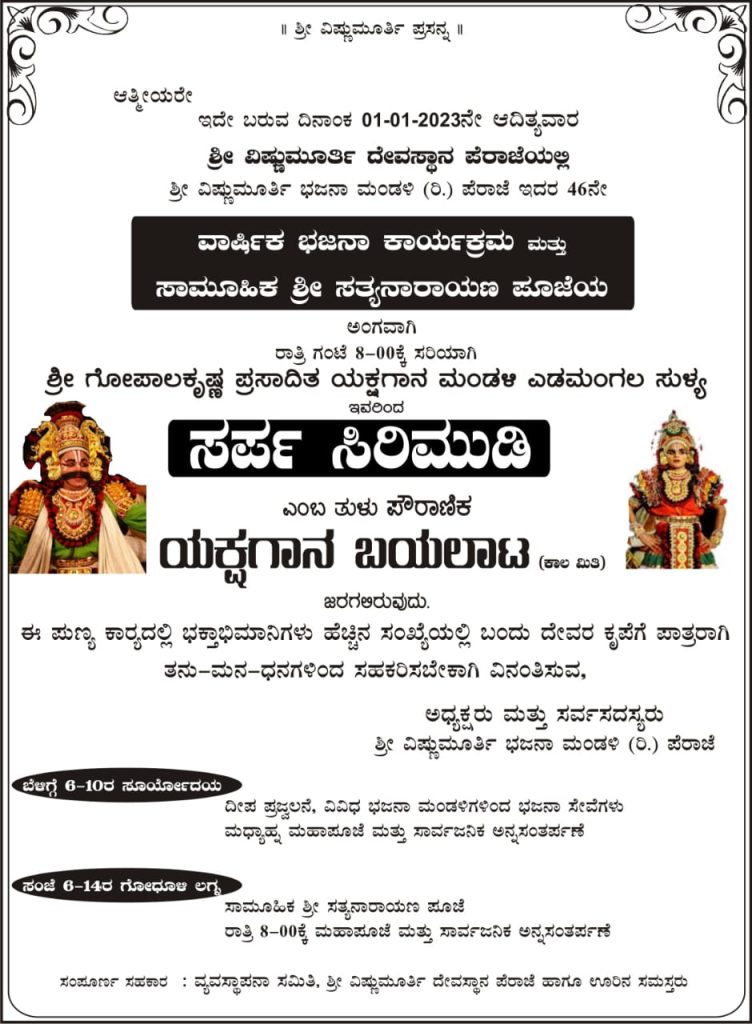 ವಿಷ್ಣುಮೂರ್ತಿ ಭಜನಾ ಮಂಡಳಿ(ರಿ.) ಪೆರಾಜೆ ವತಿಯಿಂದ ಜ.01 ರಂದು 46ನೇ ವರ್ಷದ ವಾರ್ಷಿಕ ಭಜನೆ ಹಾಗೂ 43ನೇ ವರ್ಷದ ಸಾಮೂಹಿಕ ಶ್ರೀ ಸತ್ಯನಾರಾಯಣ ಪೂಜೆ – ಕಹಳೆ ನ್ಯೂಸ್