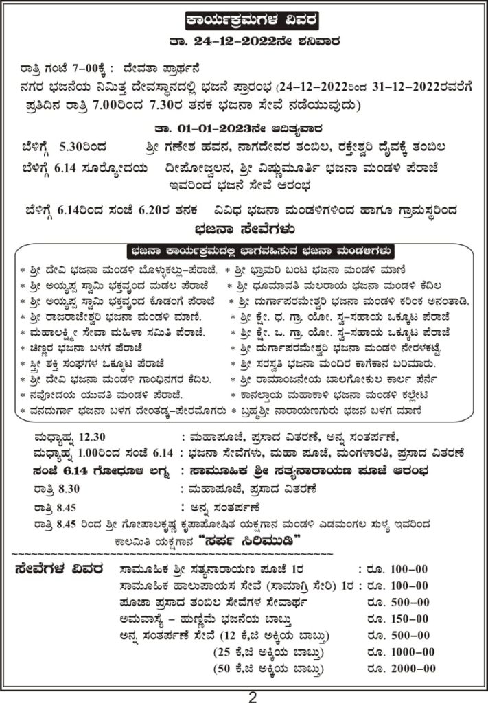 ಜ.01ರಂದು ದೇವತಾ ಪ್ರಾರ್ಥನೆ, ವಿವಿಧ ಭಜನಾ ಮಂಡಳಿಗಳಿAದ ಭಜನಾ ಸೇವೆ, ಶ್ರೀ ಗಣೇಶ ಹವನ, ನಾಗದೇವರ ತಂಬಿಲ, ರಕ್ತೇಶ್ವರಿ ದೈವಕ್ಕೆ ತಂಬಿಲ, ಮಹಾಪೂಜೆ, ಪ್ರಸಾದ ವಿತರಣೆ, ಅನ್ನಸಂತರ್ಪಣೆ ಹಾಗೂ ಸಂಜೆ ಸಾಮೂಹಿಕ ಶ್ರೀ ಸತ್ಯನಾರಾಯಣ ಪೂಜೆ ನಡೆಯಲಿದೆ.