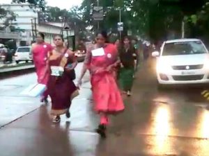 ಜಡಿ ಮಳೆಯ ನಡುವೆಯೂ ನಗರದ ಮಣ್ಣಗುಡ್ಡೆಯಿಂದ ಸೀರೆಯಲ್ಲೇ ವಾಕಿಂಗ್ ಆರಂಭಿಸಿದ ಸುಮಾರು 600ಕ್ಕಿಂತ ಹೆಚ್ಚು ಮಹಿಳೆಯರು ಮಂಗಳಾ ಕ್ರೀಡಾಂಗಣ ಮೂಲಕ ಮತ್ತೆ ಮಣ್ಣಗುಡ್ಡ ತಲುಪಿ ಎರಡು ಕಿ.ಮೀ. ವಾಕಿಂಗ್ ಪೂರ್ತಿಗೊಳಿಸಿದರು. ಶೂ, ಟ್ರಾಕ್ ಸೂಟ್, ಟೀ ಶರ್ಟ್ ಅಲ್ಲದೆ ಸೀರೆಯಲ್ಲೂ ವಾಕಿಂಗ್ ಮಾಡಬಹುದು ಅನ್ನೋದನ್ನು ಮಹಿಳೆಯರು ಸಾಬೀತುಪಡಿಸಿದರು.