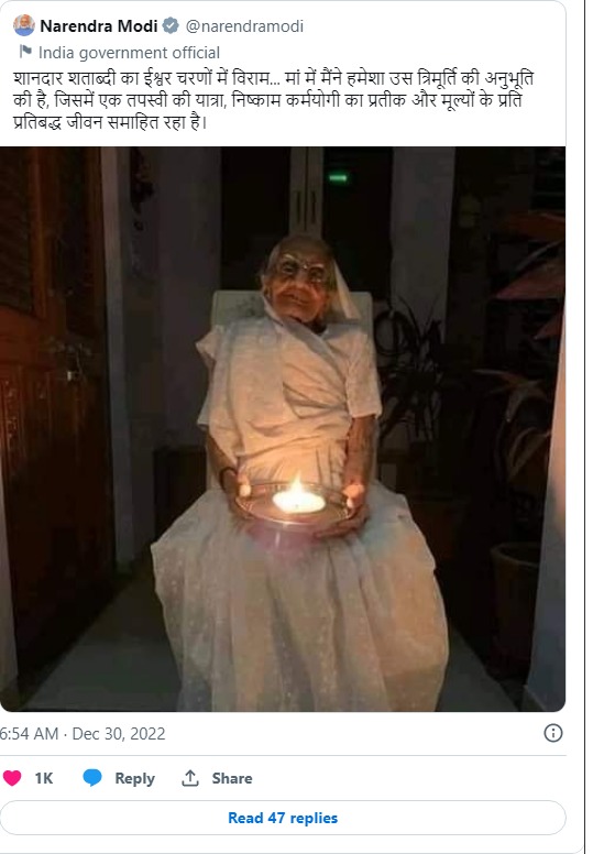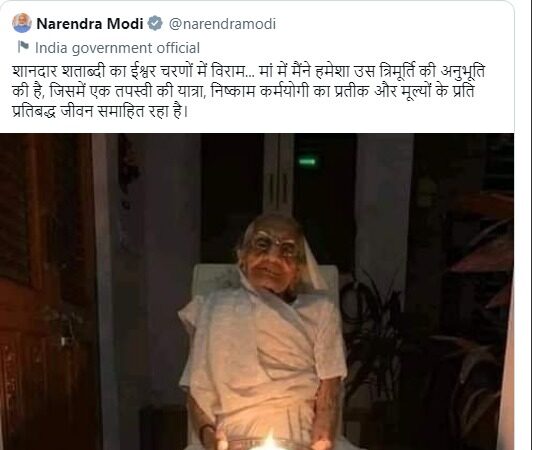 ತಾಯಿ ನಿಧನಕ್ಕೆ ಭಾವುಕರಾಗಿರುವ ಮೋದಿ ಟ್ವೀಟ್ ಮೂಲಕ ನೋವನ್ನ ವ್ಯಕ್ತಪಡಿಸಿದ್ದಾರೆ. ‘ಭವ್ಯವಾದ ಶತಮಾನವು ದೇವರ ಪಾದ ಸೇರಿದೆ. ಅಮ್ಮನಲ್ಲಿಯೇ ನಾನು ಆ ತ್ರಿಮರ್ತಿಗಳನ್ನು ಕಾಣುತ್ತಿದೆ. ತಪಸ್ವಿಯ ಪ್ರಯಾಣ, ನಿಸ್ವರ್ಥ ರ್ಮಯೋಗಿಯ ಸಂಕೇತ ಮತ್ತು ಮೌಲ್ಯಗಳಿಗೆ ಬದ್ಧವಾಗಿರುವ ಜೀವನವನ್ನು ಒಳಗೊಂಡಿತ್ತು’ ಎಂದು ಪ್ರಧಾನಿ ನರೇಂದ್ರಮೋದಿ ಭಾವುಕರಾಗಿ ಟ್ವೀಟ್ ಮಾಡಿದ್ದಾರೆ.
