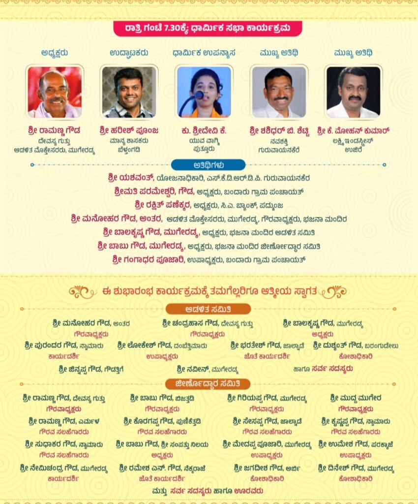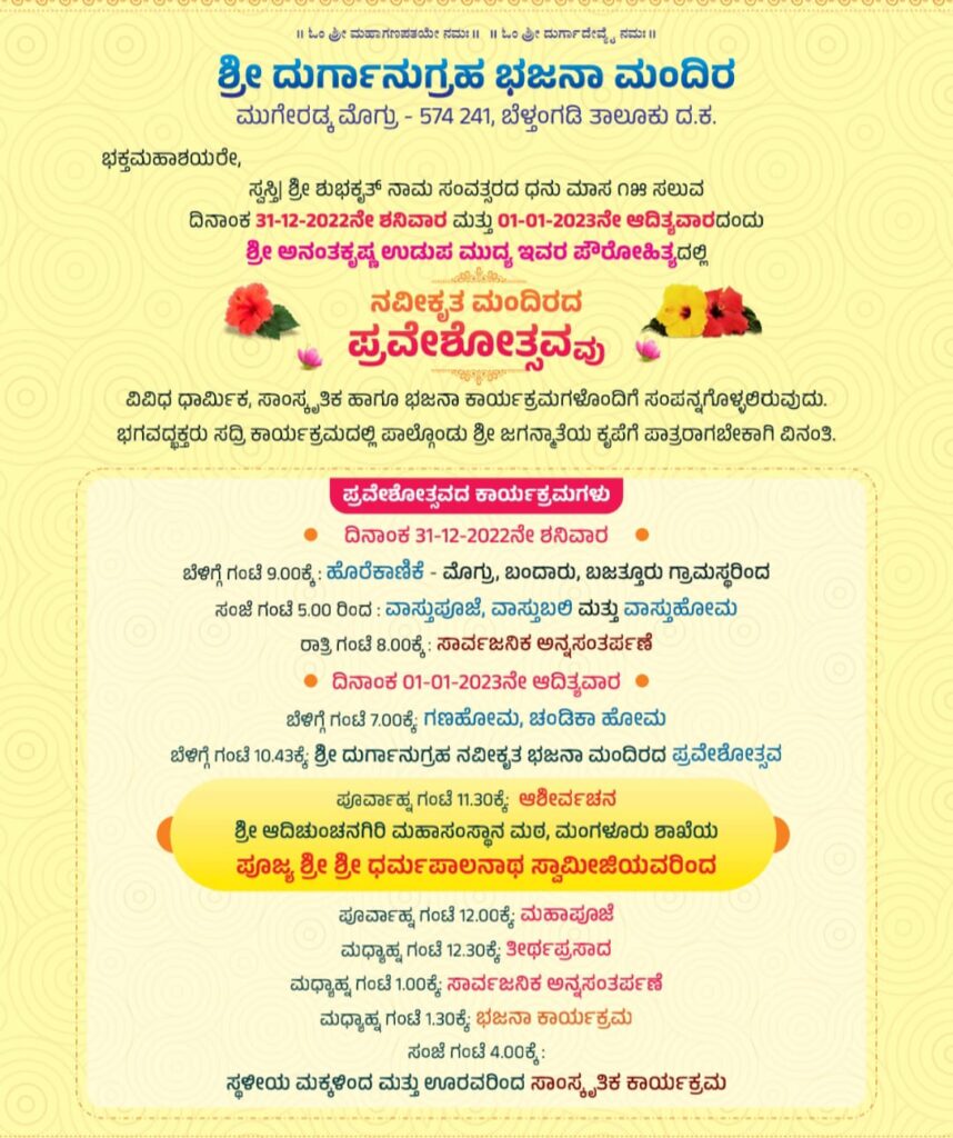 ಜ.01-01-2023 ನೇ ಆದಿತ್ಯವಾರದಂದು ಪೂರ್ವಾಹ್ನ ಗಣಹೋಮ, ಚಂಡಿಕಾ ಹೋಮ ನಡೆದ ಬಳಿಕ ಶ್ರೀ ದುರ್ಗಾನುಗ್ರಹ ನವೀಕೃತ ಭಜನಾ ಮಂದಿರದ ಪ್ರವೇಶೋತ್ಸವ ನಡೆಯಲಿದೆ. ಈ ಸಂದರ್ಭ ಶ್ರೀ ಆದಿಚುಂಚನಗಿರಿ ಮಹಾಸಂಸ್ಥಾನ ಮಠದ ಪೂಜ್ಯ ಶ್ರೀ ಶ್ರೀ ಧರ್ಮಪಾಲನಾಥ ಸ್ವಾಮೀಜಿಯವರು ಆಶೀರ್ವಚನ ನಿಡಲಿದ್ದಾರೆ. ಬಳಿಕ ಭಜನಾ ಸಂಕೀರ್ತನೆ ಹಾಗೂ ವಿವಿಧ ಧಾರ್ಮಿಕ ಸಾಂಸ್ಕøತಿಕ ಕಾರ್ಯಕ್ರಮಗಳೊಂದಿಗೆ ಮಂದಿರದ ಪ್ರವೇಶೋತ್ಸವವು ಸಂಪನ್ನಗೊಳ್ಳಲಿದೆ. ಭಕ್ತಾಧಿಗಳು ಕಾರ್ಯಕ್ರಮದಲ್ಲಿ ಪಾಲ್ಗೊಂಡು ಶ್ರೀ ಜಗನ್ಮಾತೆಯ ಕೃಪೆಗೆ ಪಾತ್ರರಾಗಬೇಕಾಗಿ ಸಮಿತಿಯು ವಿನಂತಿಸಿದೆ.